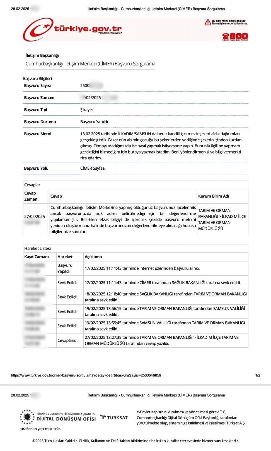 Şikayette bulunan kişi, şekerin alındığı işletmenin adresini dilekçeye ekleyerek tekrar başvuruda bulunacağını ifade etti.