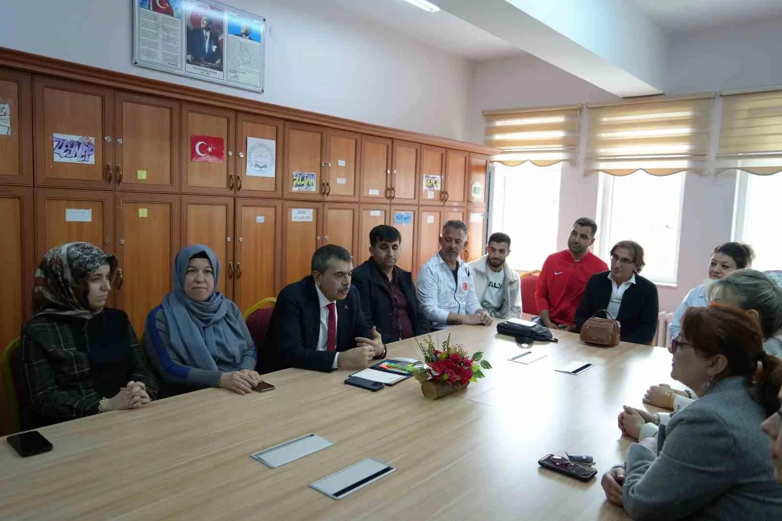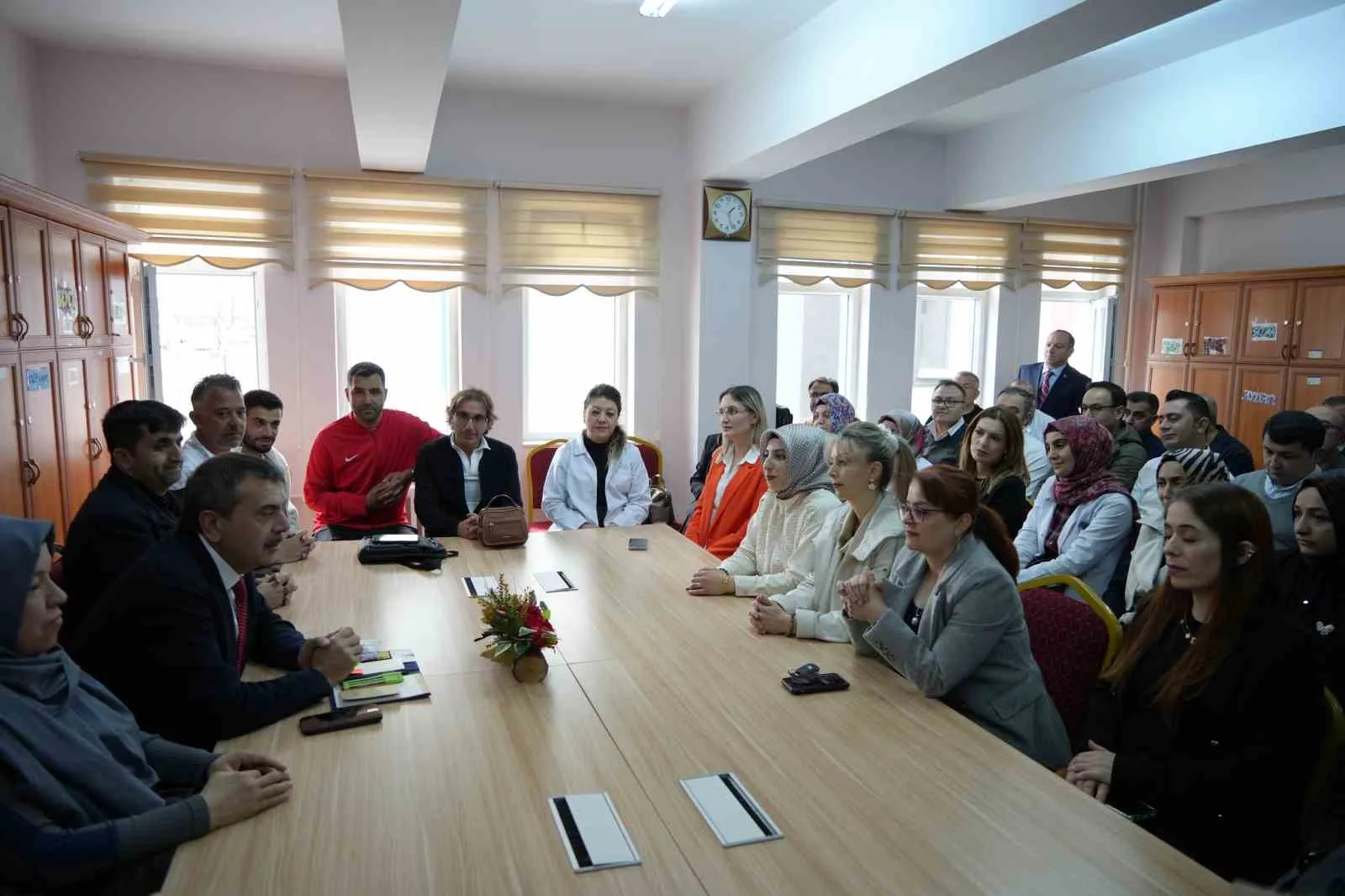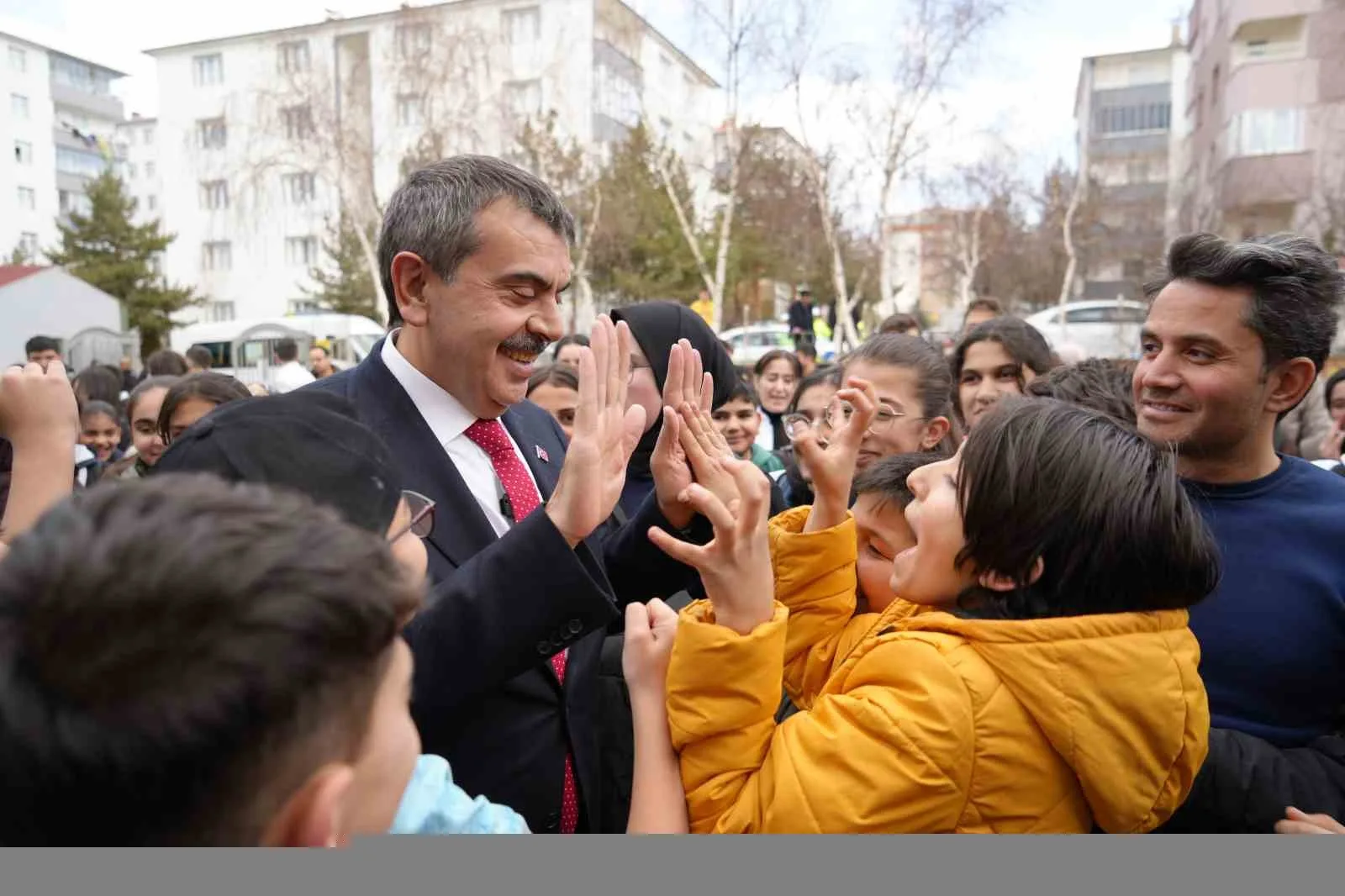 ERZURUM PALANDÖKEN İLÇESİNDE KAYAKYOLU ÇİMENTO MÜSTAHSİLLERİ İŞVEREN SENDİKASI ORTAOKULU’NDA ÖĞRETMEN ODASI BULUŞMASI VE BAYRAK TÖRENİNE KATILAN BAKAN TEKİN HEM ÖĞRETMEN HEM DE ÖĞRENCİLERLE SOHBET ETTİ.