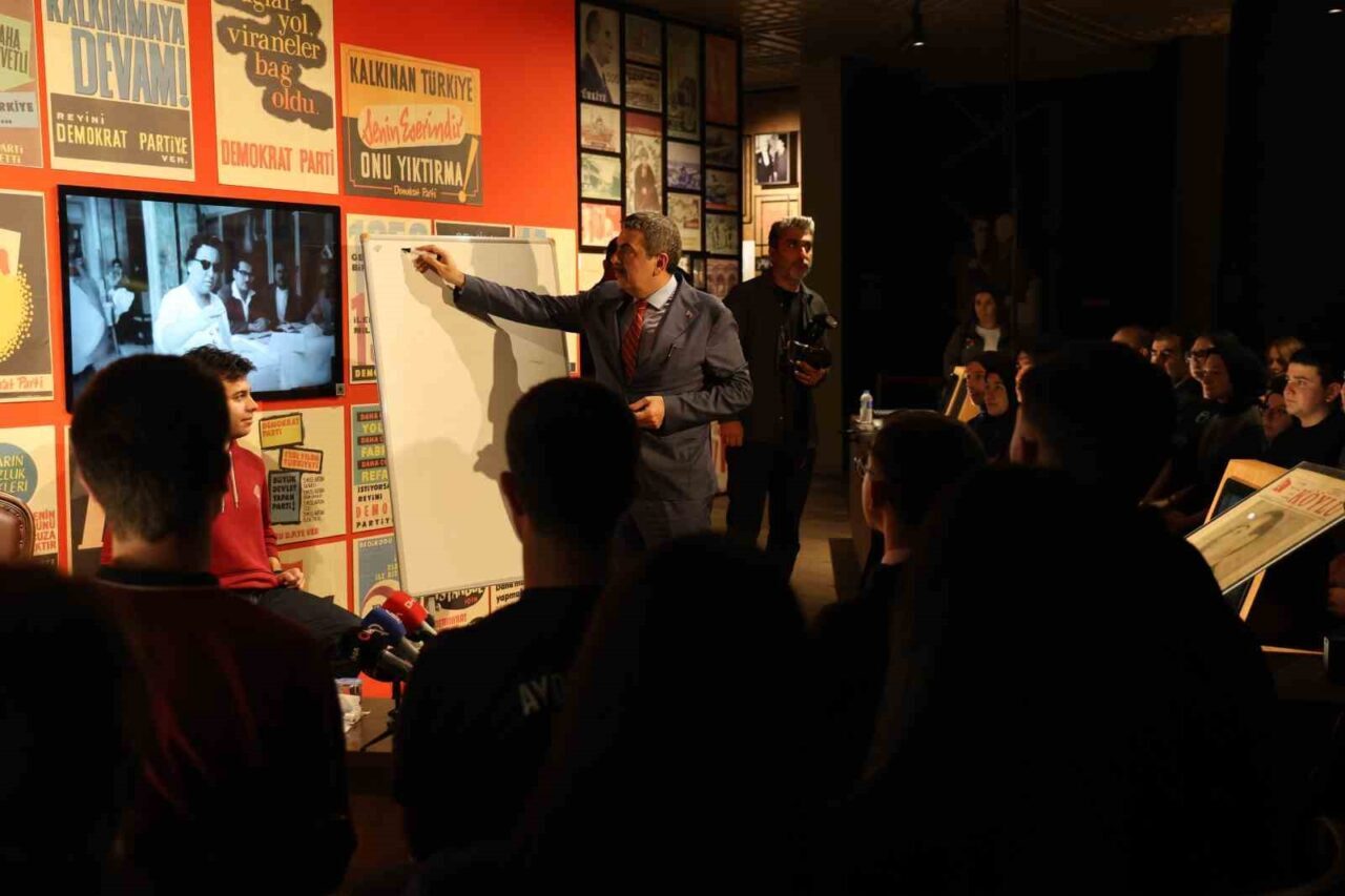 Demokrasi ve milli egemenlik tarihi bakımından Nisan ayını önemsediklerini ve bu nedenle bu ayı ‘Milli Egemenlik ve Demokrasi Ayı’ ilan ettiklerini kaydeden Bakan Tekin, Demokrasi Müzesi’nde verdiği dersinde demokrasi şehidi Aydınlı Başvekil Adnan Menderes’in siyasi hayatı ve o dönemde yaşananlardan bazı kesitlere yer verdi. Adnan Menderes’in içinde siyasete başladığı CHP’nin takip ettiği politikayı, ülke çıkarları adına beğenmeyerek Celal Bayar ile Demokrat Parti’yi kurduğunu belirten Tekin, Türkiye’de birden fazla siyasi partinin katıldığı ilk seçimde açık oy kullanılıp gizli sayım yapılan günleri anlattı. 27 Mayıs 1960’da halkın iradesi yok sayılarak yapılan darbeden de kısaca söz eden Bakan Tekin, millet iradesi ve demokrasinin önemine değindi.