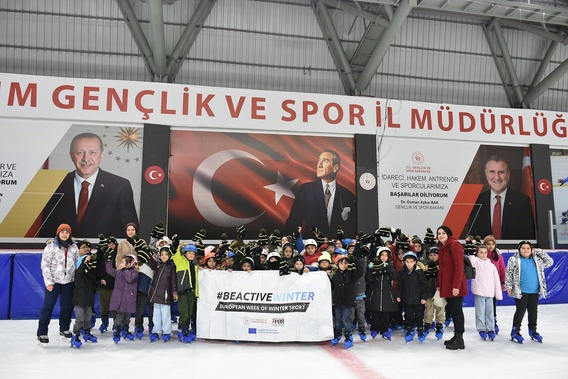 Herkes İçin Spor Federasyonu (HİS) Erzurum Gençlik ve Spor İl Müdürlüğü tarafından başlatılan Kış Sporları Haftası Projesi kapsamında Palandöken Spor Kampüsü 500’lük buz salonunda buz pateni eğitimi alan çocuklara bere dağıttı.