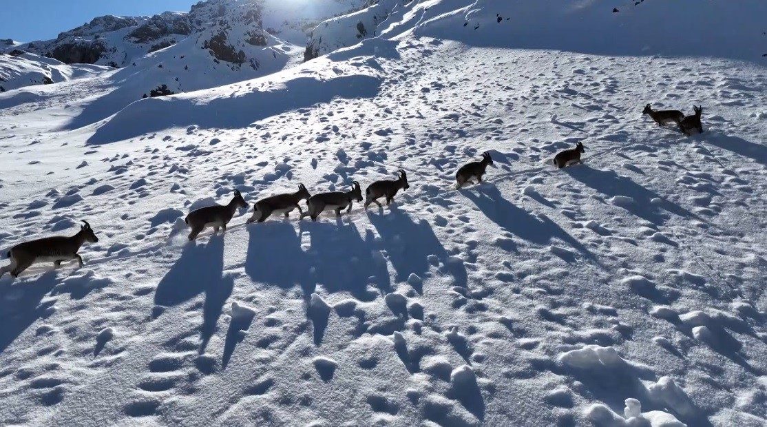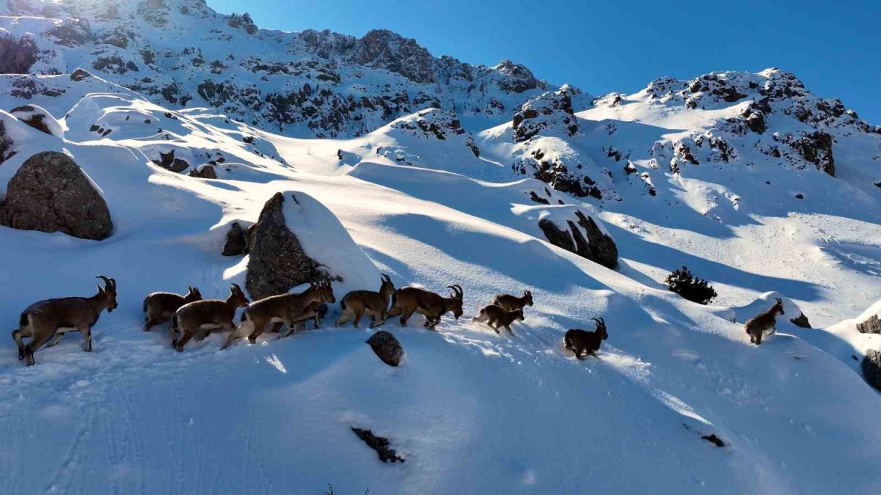 Koruma altındaki yaban keçilerinin karlı zirvelerdeki bu yolculuğu, doğanın eşsiz manzaralarını bir kez daha gözler önüne serdi.