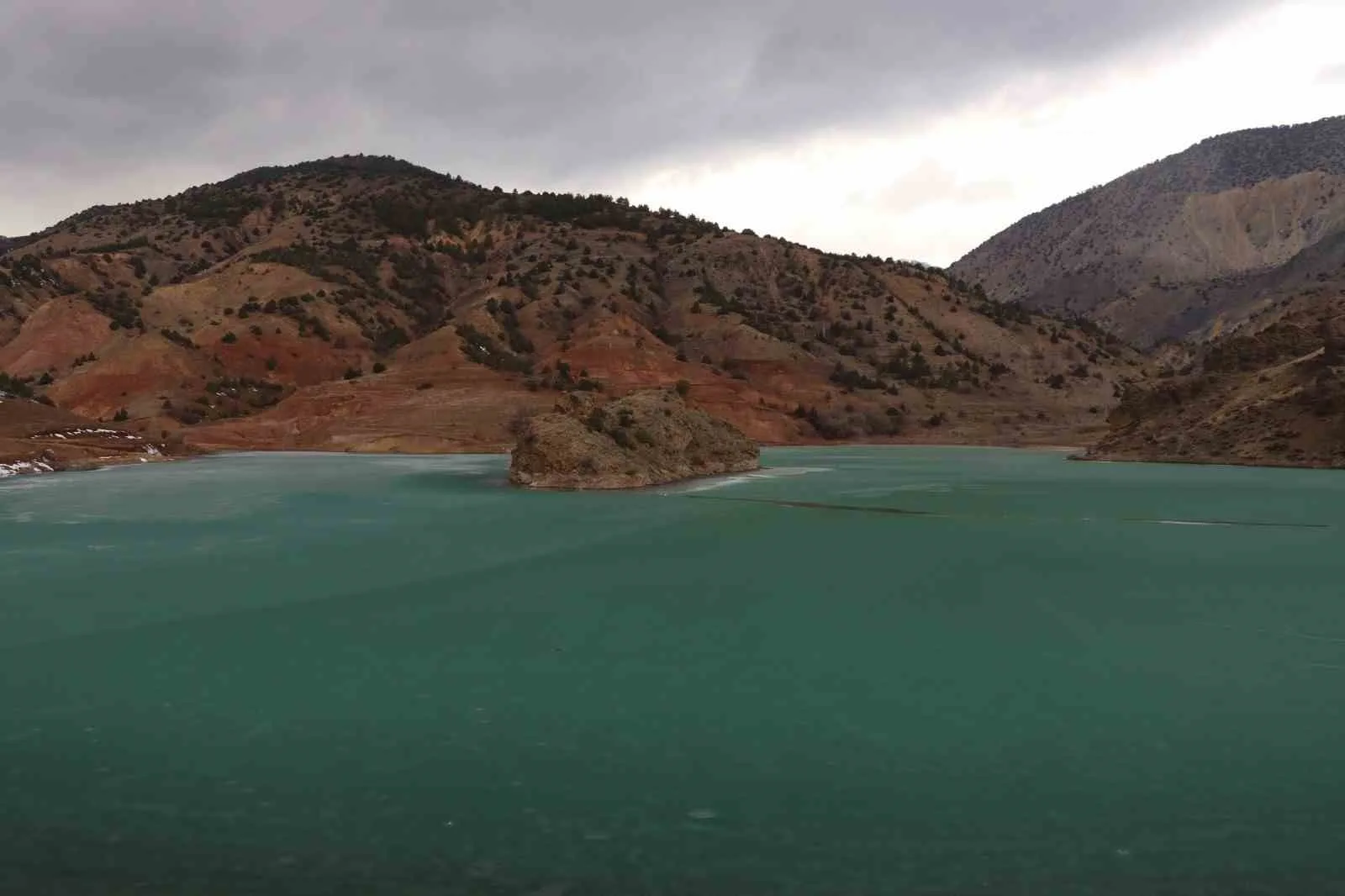Erzurum’un Oltu ilçesi Şendurak Mahallesi’nde DSİ tarafından inşa edilen sulama göleti, turkuaz rengiyle muazzam bir doğa harikası haline dönüştü.