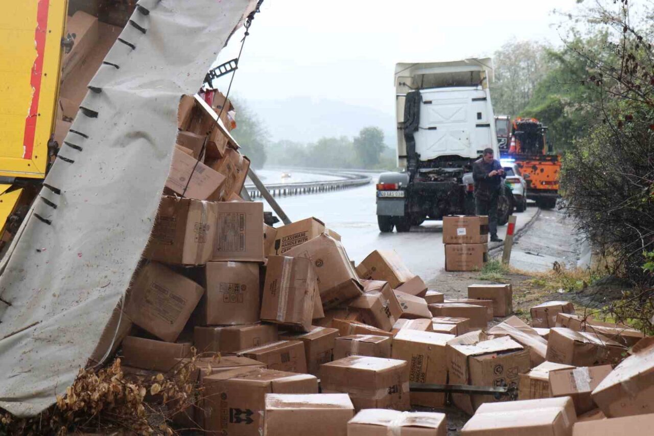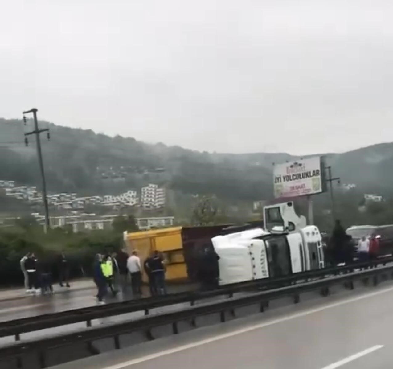 Anadolu Otoyolu Sakarya geçişinde kontrolden çıkan tır, bariyerlere çarparak devrildi. Meydana gelen kaza sonrasında kilometrelerce oluşan araç kuyruğunda sürücüler kontak kapattı. Tırın bölgeden kaldırılma çalışmaları devam ederken kaza anı güvenlik kamerasına yansıdı.