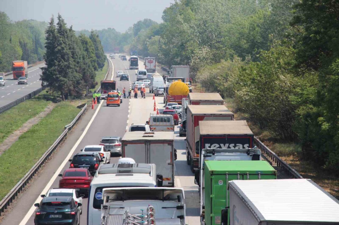 Anadolu Otoyolu Sakarya geçişinde lastiğinin patlaması neticesinde sürücüsünün kontrolünden çıkarak bariyerlere çarpan tır, makasladı. Kaza sebebi ile Ankara istikametinde uzun araç kuyrukları oluştu.