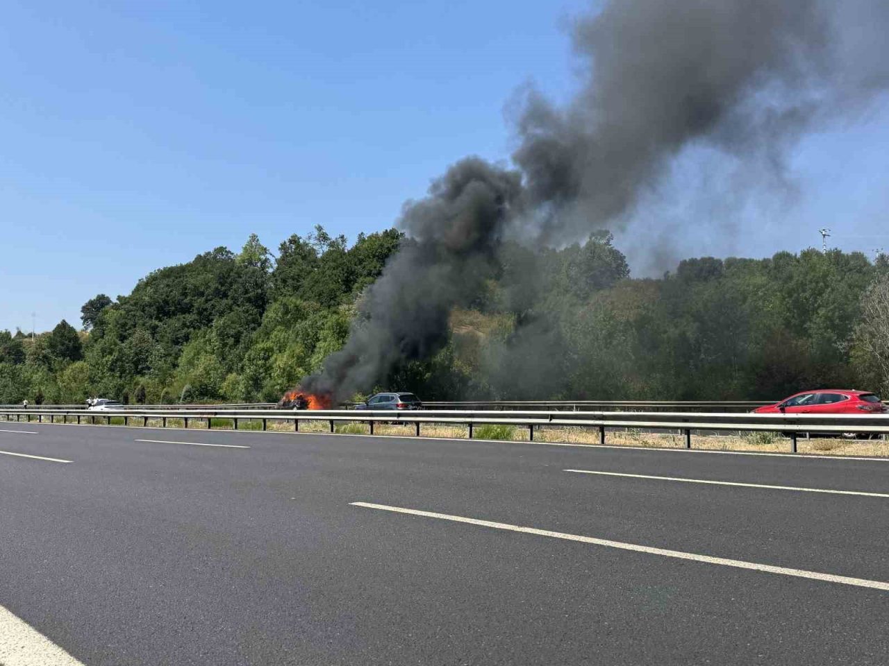 Anadolu Otoyolu Sakarya geçişinde seyir halindeyken alev alev yanan yabancı plakalı otomobilden geriye, demir yığınları kaldı.