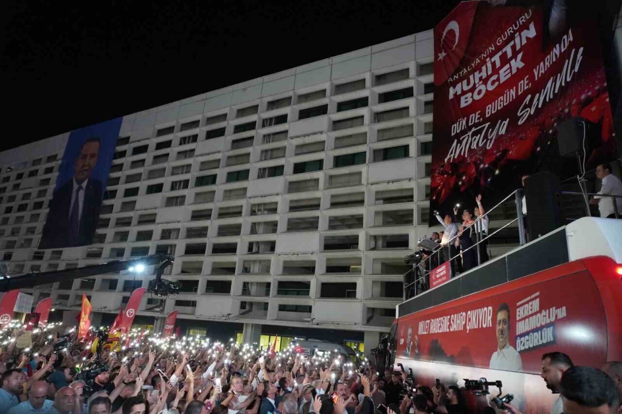 CHP Genel Başkanı Özgür Özel’in konuşmasından önce tutuklu Antalya Büyükşehir Belediye Başkanı Muhittin Böcek’in miting alanına gönderdiği mektup okundu. Böcek, mektubunda şu ifadelere yer verdi: “Sizlere 8 m’lik hücremden sesleniyorum. Bu hücrenin bir duvarında sizlerin yüzlerini görüyor, sizleri duyuyorum; bir duvarında bir Türk bayrağının kim ne yaparsa yapsın şanla şerefle dalgalandığını görüyorum; bir duvarında benimle birlikte yol yürüyen belediyedeki ekip arkadaşlarımı görüyorum. Dört duvarın son duvarında ise hiçbir şartta vazgeçmemeyi, yılmamayı, yorulmamayı öğrendiğim mavi gözlü devin gözlerini görüyorum. Bu duvarlar bizleri tutsak etmiş gibi gözükse de meydanlarda yüz binler, milyonlar olmamızı sağladı; bunu da biliyorum. Ben Torosların, şu dağların, hemen yanı başınızdaki köylerinde doğmuş, büyümüş bir Yörük çocuğuyum. Vatan diye ektiğim toprakta, cumhuriyet sayesinde, milletin oylarıyla uzun yıllardır Antalya’da belediye başkanlığı yapıyorum. Çok zorlu dönemler gördüm. Acıları, sıkıntıları, hatta sizlerin dualarıyla sağ çıktığım COVID dönemini yaşadım. Ama ben bugüne kadar hukukun ve vicdanların bu derece keyfi hale geldiğini ilk kez görüyorum. Bizler belediye başkanlarıyız; hesap vermenin bir vazife, bir sorumluluk olduğunu biliriz. Çok şükür ne Antalya’ma ne de vatanıma veremeyeceğim hiçbir hesabım yok. Ben tüm partilerin oyuyla, desteğiyle seçilmiş; altı kez mazbata almış olduğum için buradayım, bunu biliyorum.”