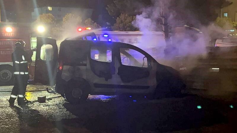 Sakarya’nın Pamukova ilçesinde park halindeki hafif ticari araç alev topuna döndü. Yangın itfaiye ekiplerince söndürülürken araçtan geriye demir yığınları kaldı.