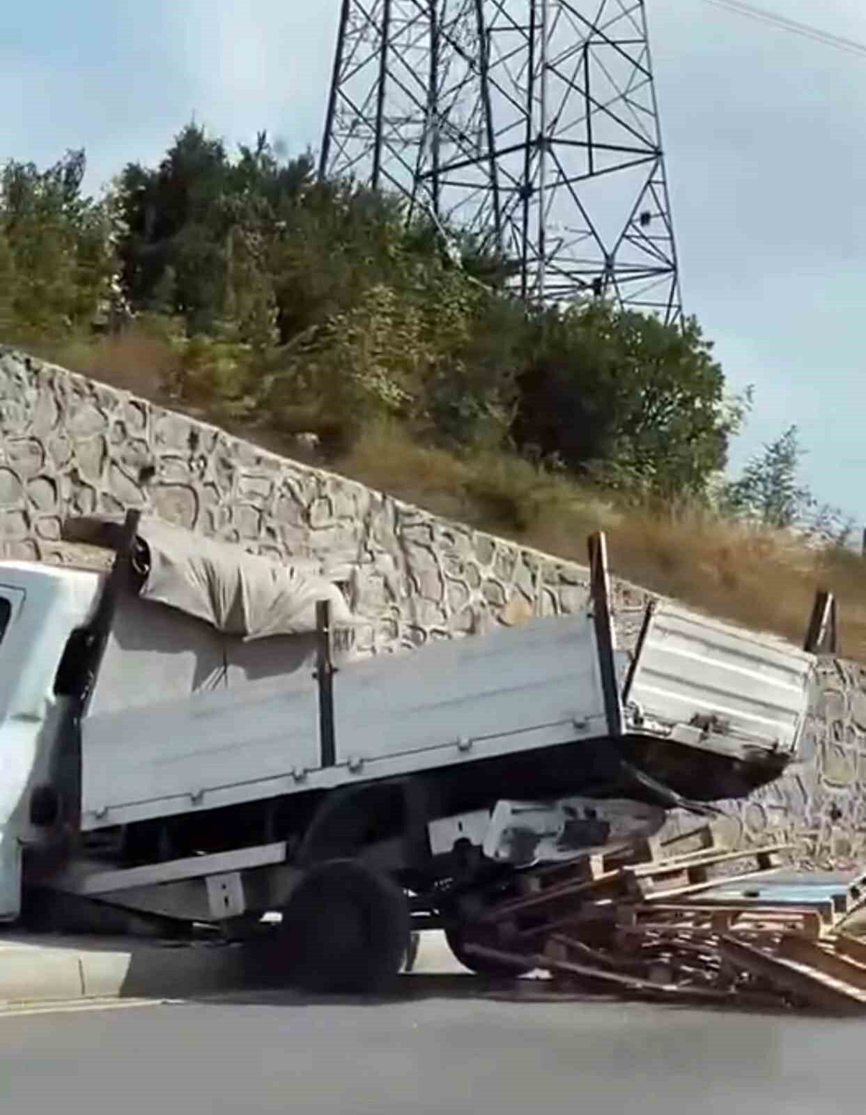 SAKARYA’NIN SERDİVAN İLÇESİNDE PARK HALİNDEKİ PALET YÜKLÜ BİR KAMYONET, METRELERCE YÜKSEKLİKTEKİ İSTİNAT DUVARI ÜZERİNDEN ANA CADDEYE DÜŞTÜ. OLAY ANINDA KALDIRIMDA YAYA, CADDE ÜZERİNDE İSE ARAÇ BULUNMAMASI MUHTEMEL BİR FACİAYI ÖNLEDİ.