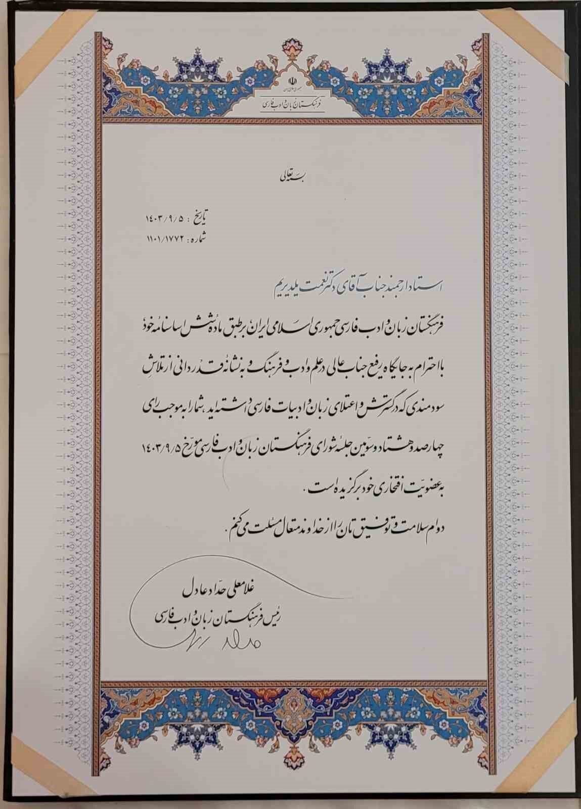 “Sayın Prof. Dr. Nimet Yıldırım, İran İslam Cumhuriyeti Fars Dili ve Edebiyatı Akademisi tüzüğünün 6. maddesi uyarınca, Fars Dili ve Edebiyatı Şurası’nın 1403/9/5 tarihli 483. toplantısında oybirliği ile, “bilim, edebiyat ve kültür” alanlarındaki seçkin ve yüksek konumunuzdan, Fars dili ve edebiyatının gelişmesi ve yücelmesindeki çabalarınız ve katkılarınızdan dolayı kadirşinaslık göstergesi olarak sizi “Bilim Kurulu” üyesi olarak seçmiştir. Sağlığınızın ve başarınızın devamını Yüce Allah’tan niyaz ediyorum. Fars Dili ve Edebiyatı Akademisi Başkanı Ğolamali Haddad Adil”