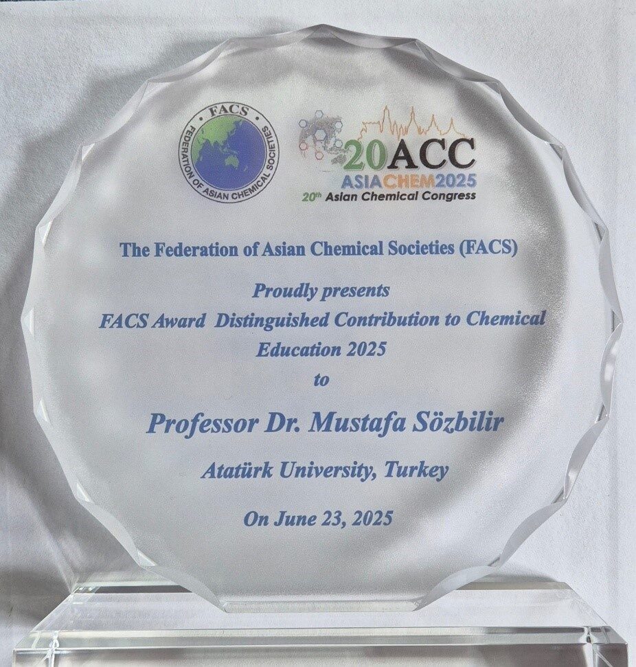23-27 Haziran 2025 tarihleri arasında Tayland’ın başkenti Bangkok’ta düzenlenen 20. Asya Kimya Kongresi (ASIACHEM 2025) kapsamında, Prof. Dr. Sözbilir’e “FACS Distinguished Contribution to Chemical Education Award 2025” (Kimya Eğitimine Seçkin Katkı Ödülü) verildi.