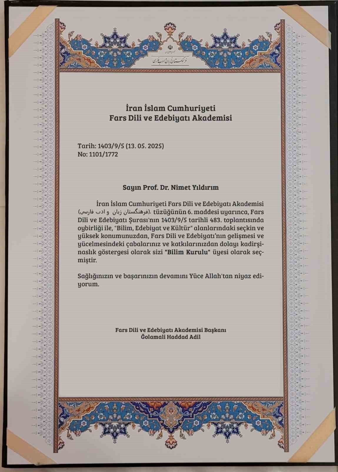 Geçtiğimiz hafta yapılan kurul toplantısında alınan kararla Prof. Dr. Yıldırım, Fars Dili ve Edebiyatı alanındaki akademik birikimi, kültürel katkıları ve uluslararası alandaki itibarı dolayısıyla akademi üyelerinin tamamının oylarıyla bu onurlu göreve layık görüldü. Başkent Tahran’da düzenlenen törende, üyeliği resmen ilan edilen Prof. Dr. Yıldırım’a, kurul üyeliğini belgeleyen resmi evrak, Fars Dili ve Edebiyatı Akademisi Başkanı ve aynı zamanda İran İslam Cumhuriyeti Bilim ve Kültür alanında önemli bir isim olan Ğolamali Haddad Adil tarafından takdim edildi.