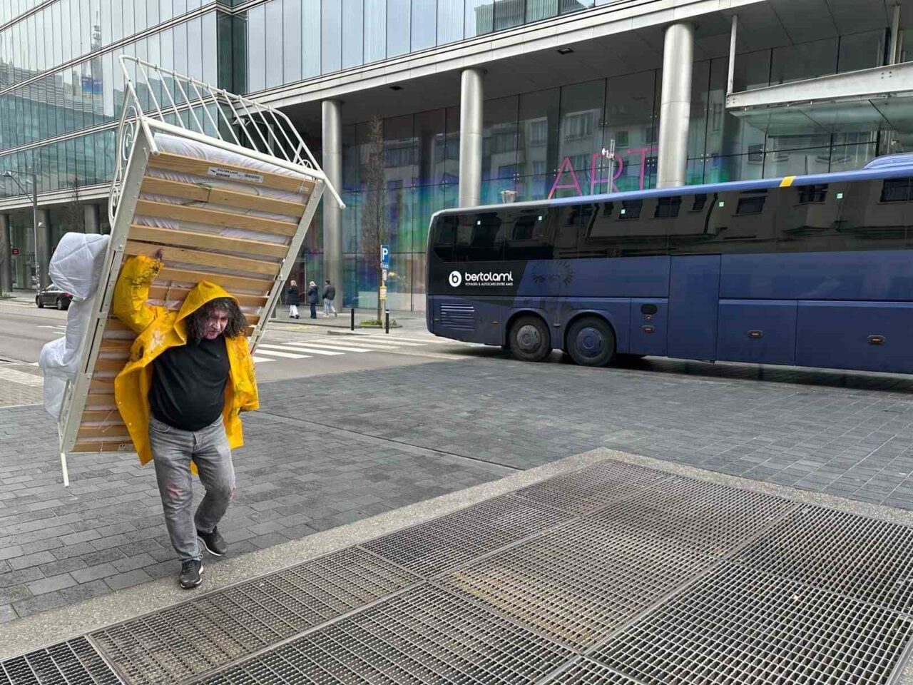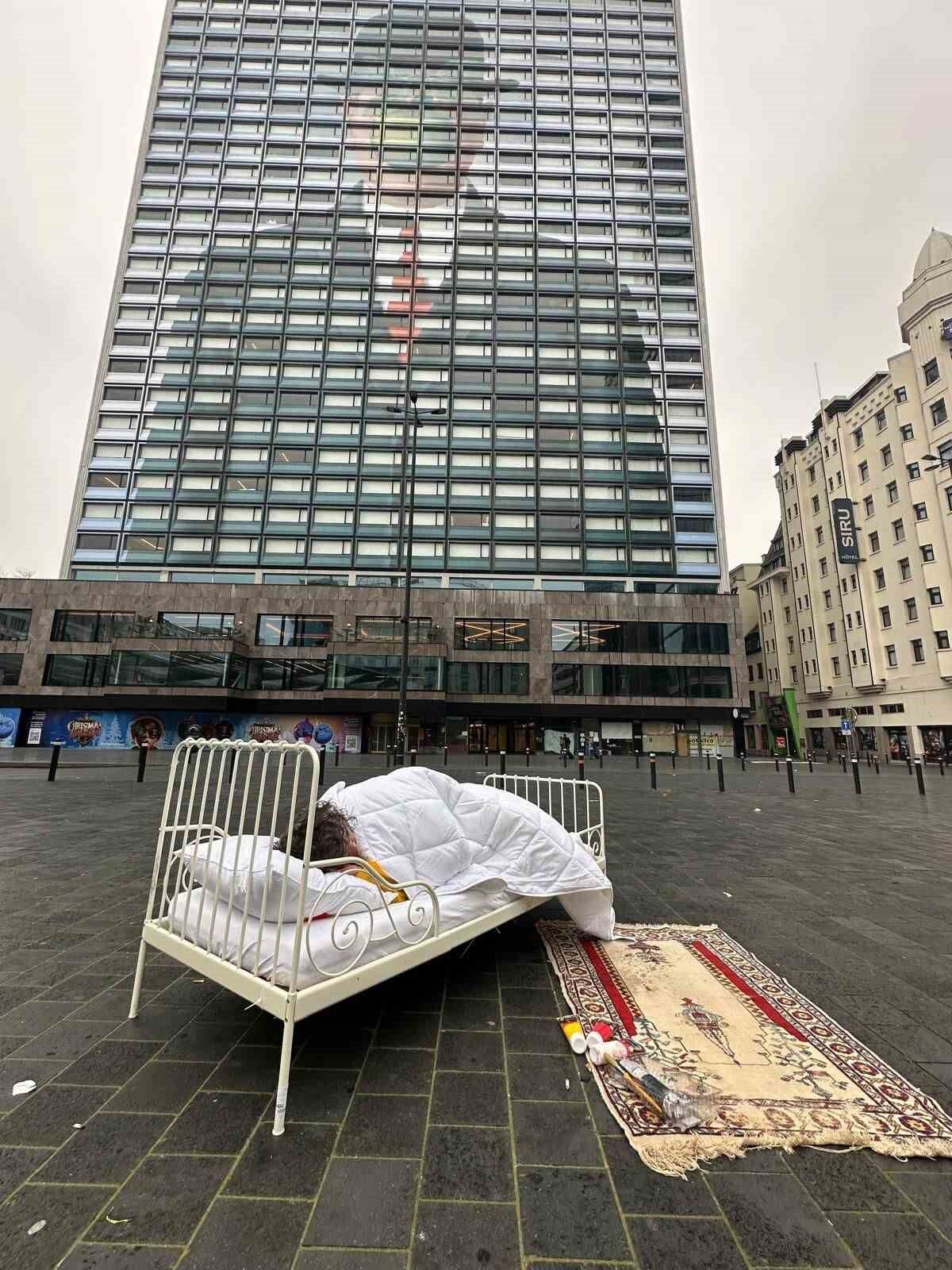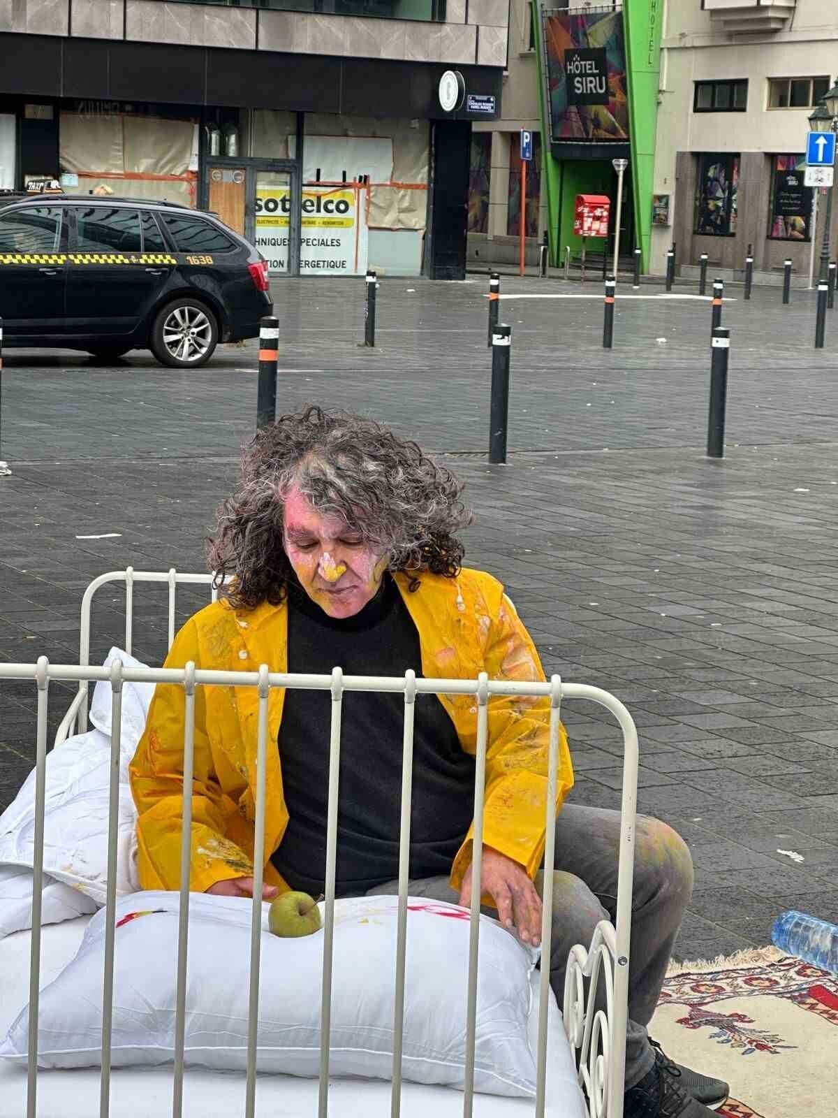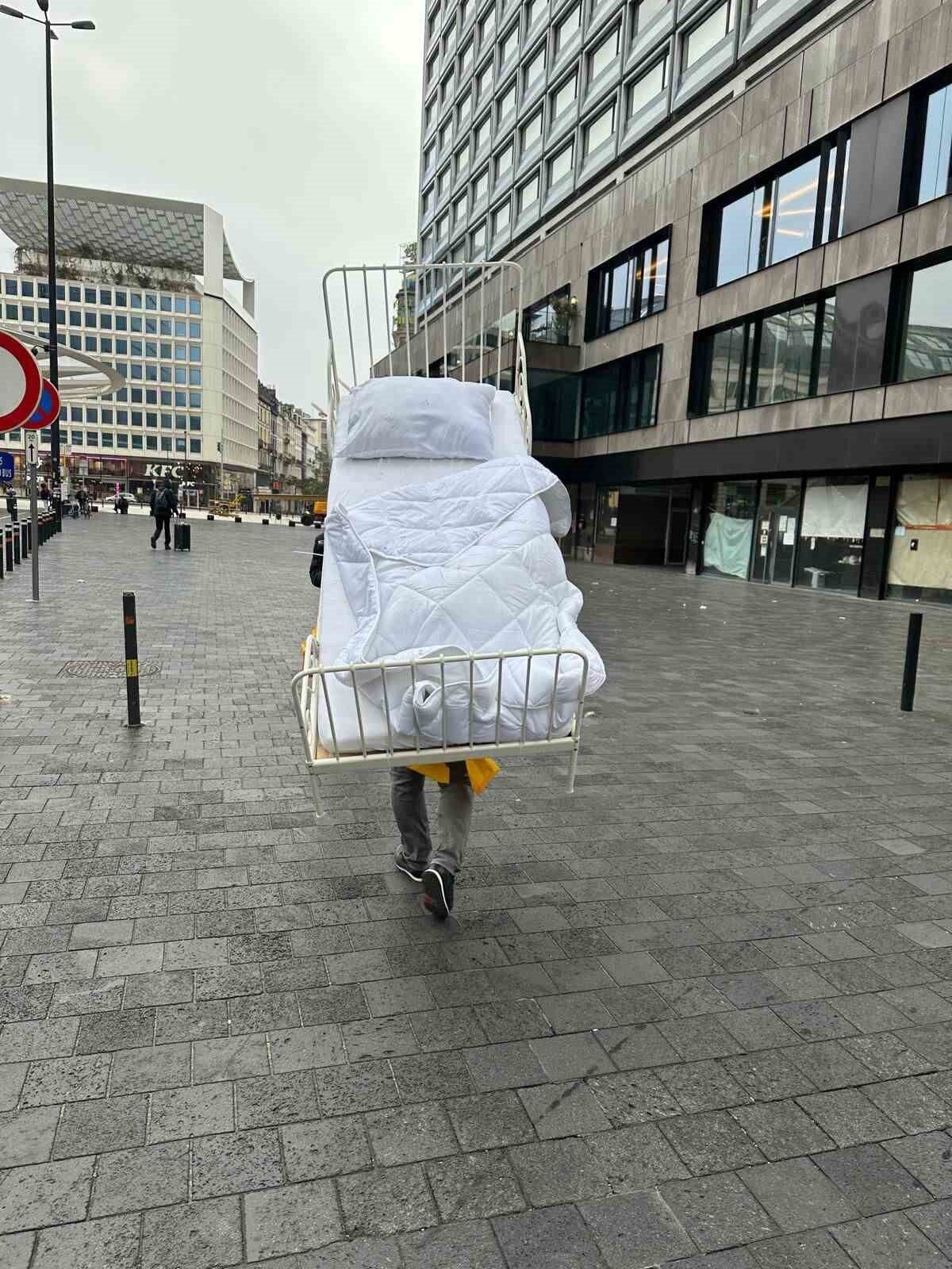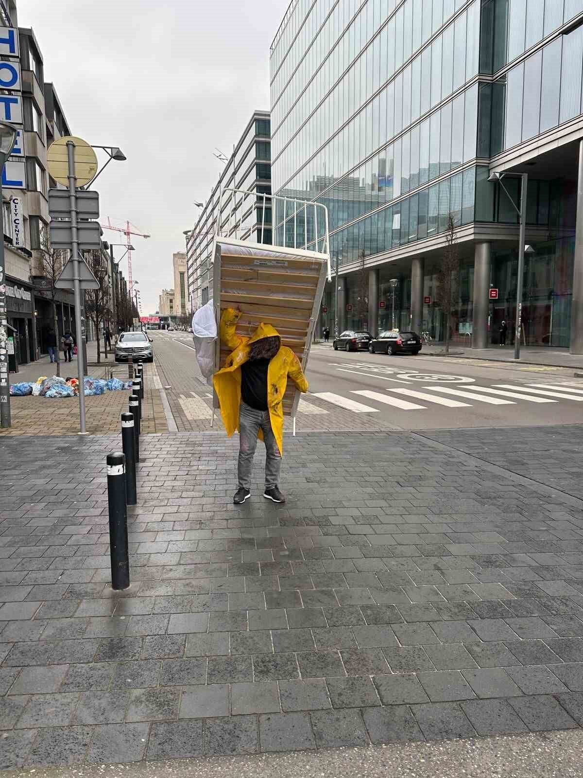 Göçmenlerin geçici barınma şartlarını simgeleyen metal karyolayı Brüksel Kuzey Tren İstasyonu’ndan Rogier Meydanı’na kadar sırtında taşıyan Kavukcu, performans sırasında karyolayı zaman zaman sürükleyerek ilerledi.