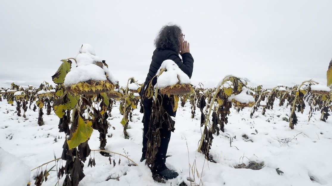 Prof. Dr. Mehmet Kavukcu, karlı bir ayçiçeği tarlasında gerçekleştirdiği “Ego” performansıyla insanın doğa üzerindeki tahakkümünü ve modern bireyin ekolojik yabancılaşmasını sembolik bir dille eleştirdi.