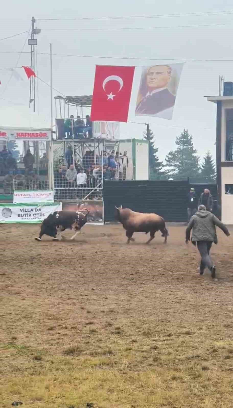 Her yıl geleneksel olarak düzenlenen ve bu yıl 44’üncüsü gerçekleştirilen Kafkasör Kültür ve Sanat Festivali 2’nci gününde de renkli görüntülere sahne oldu. Artvin’in Kafkasör Yaylası’nda düzenlenen festivali izlemek isteyen binlerce vatandaş arenadaki yerini alırken boğalar kıran kırana mücadele etti. Yaylaya çıkmadan önce boğaları tanıştırmak maksatlı düzenlenen ve geçmişten bugüne kadar gelenek olarak gelen boğa güreşleri renkli görüntülere sahne oldu. Ayak kategorisinde güreşlerin gerçekleştiği sırada rakibinden kaçmak isteyen Kılıç 420 isimli boğa koşmaya başlayınca bakıcısını boynuz darbesiyle altına aldı. Boğadan darbe alan bakıcısı yaralanmadan ayağa kalkarken güreşi izleyen vatandaşlar o anları cep telefonlarıyla anbean kayıt altına aldı.
