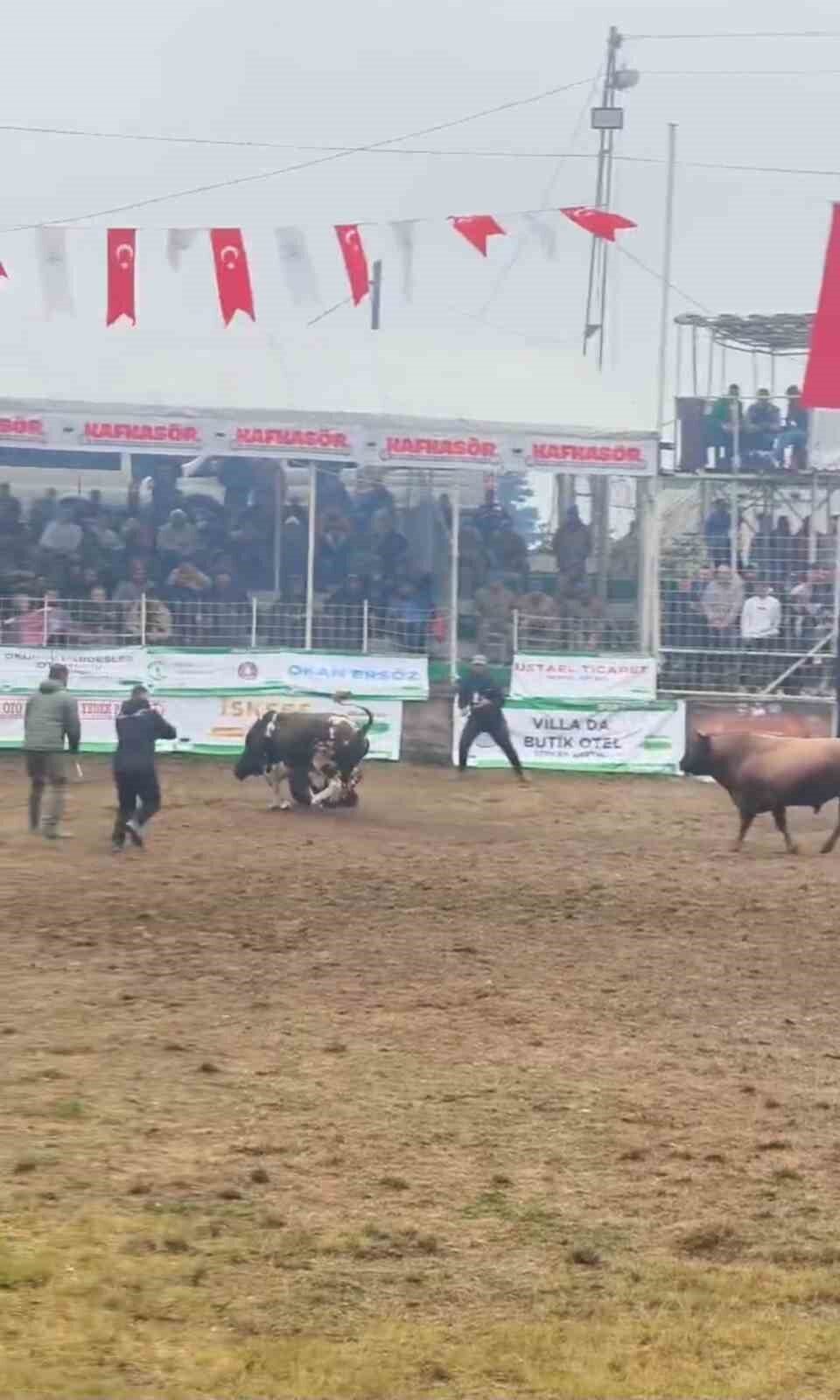 AKİBİNDEN KAÇMAK İSTEYEN BOĞA ARENADA BULUNAN BAKICISINI BOYNUZ DARBESİYLE YERE SERDİ