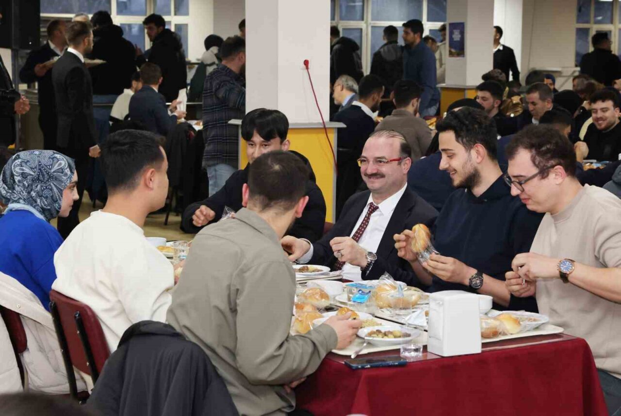 Rektör Yardımcıları ve birim yöneticilerinin de yer aldığı iftar programında konuşan Rektör Prof. Dr. Ahmet Hacımüftüoğlu, Ramazan ayının manevi atmosferinde öğrencilerle aynı sofrayı paylaşmanın kendileri için ayrı bir anlam taşıdığını belirterek: “Bu müstesna Ramazan sofrasında sizlerle bir araya gelmekten büyük bir memnuniyet duyuyorum. Bu bereketli ayın manevi ikliminde aynı sofrayı paylaşmak, gönül birlikteliğimizi daha da güçlendirmektedir” ifadelerini kullandı.