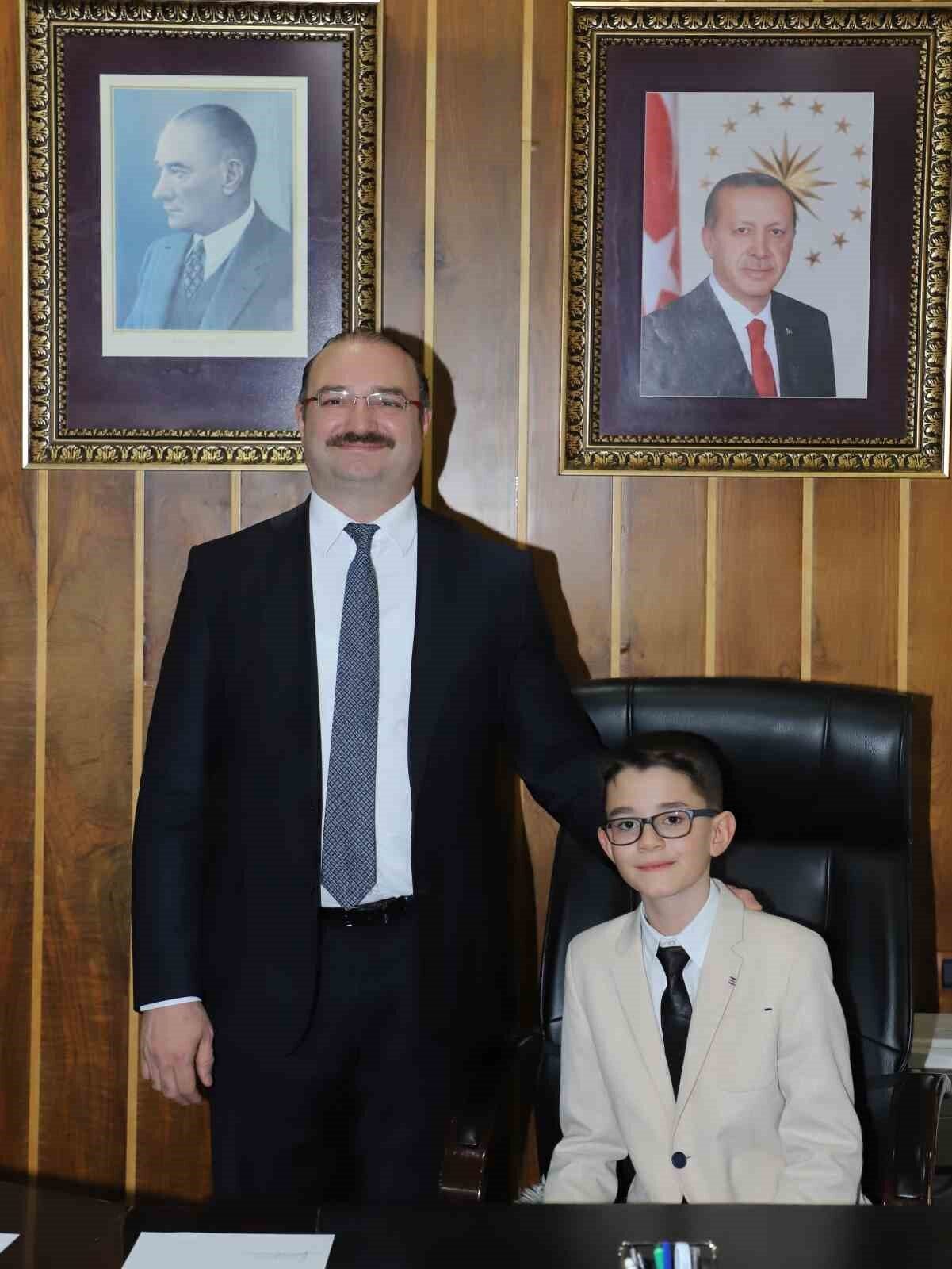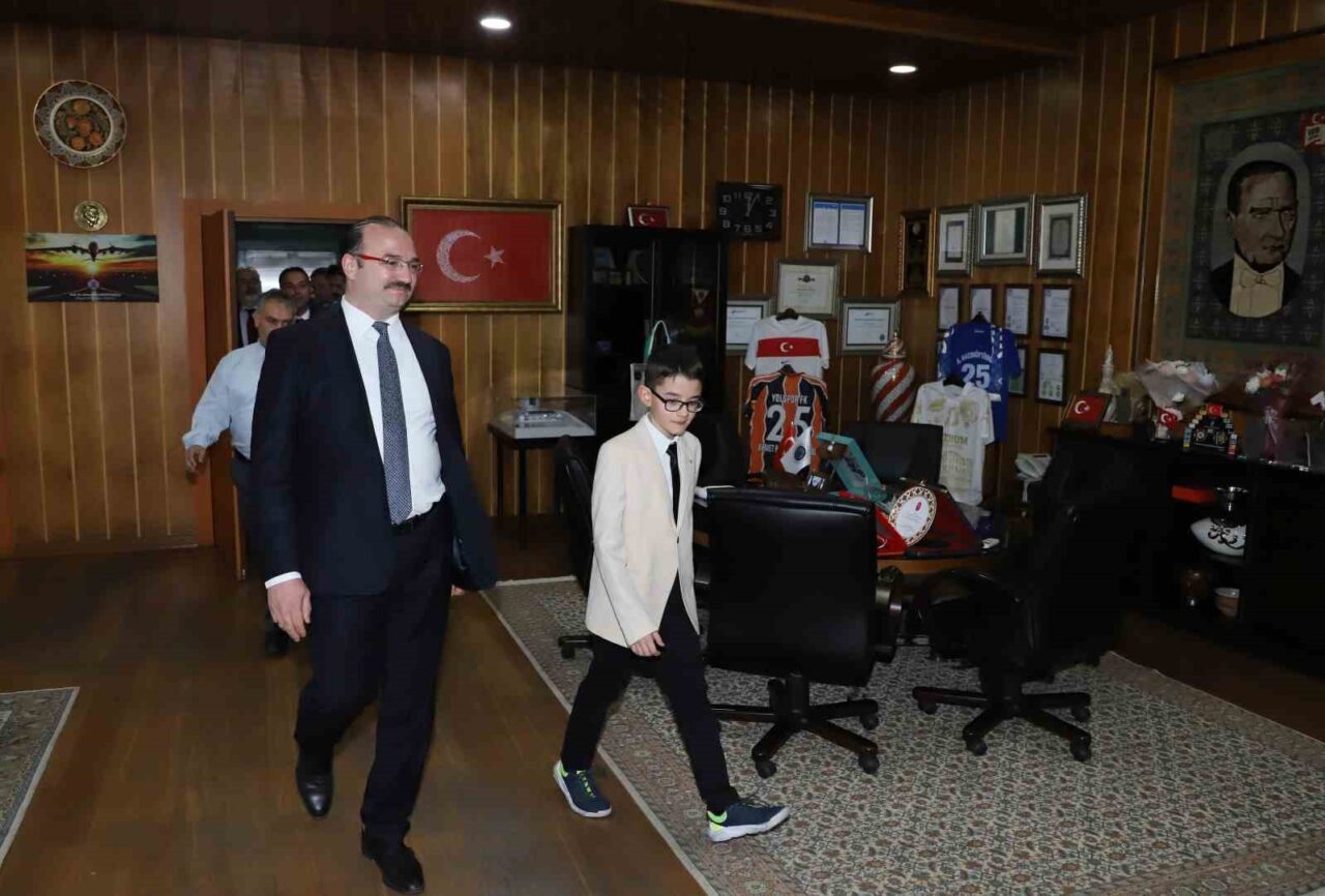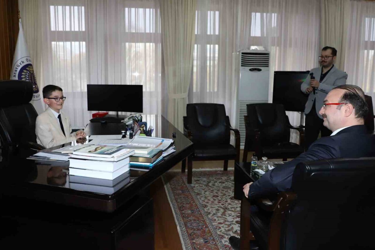 Gazi Mustafa Kemal Atatürk’ün çocuklara armağan ettiği bu özel günde, temsili devir teslim töreni çerçevesinde, Atatürk Üniversitesi Rektörü Prof. Dr. Ahmet Hacımüftüoğlu koltuğunu bir günlüğüne Vakıf Okulları 5. sınıf öğrencisi Ahmet Enes Sağlam’a devretti.