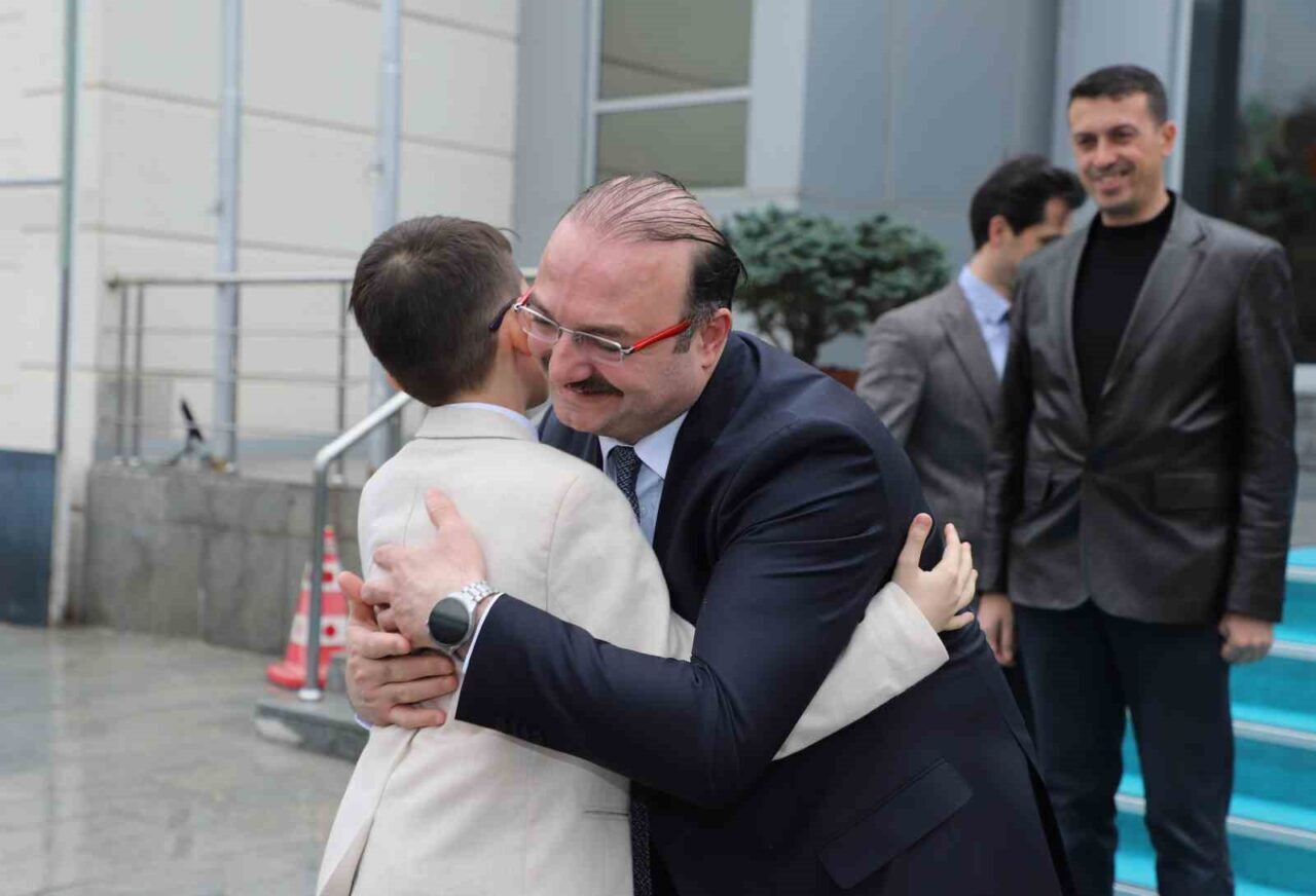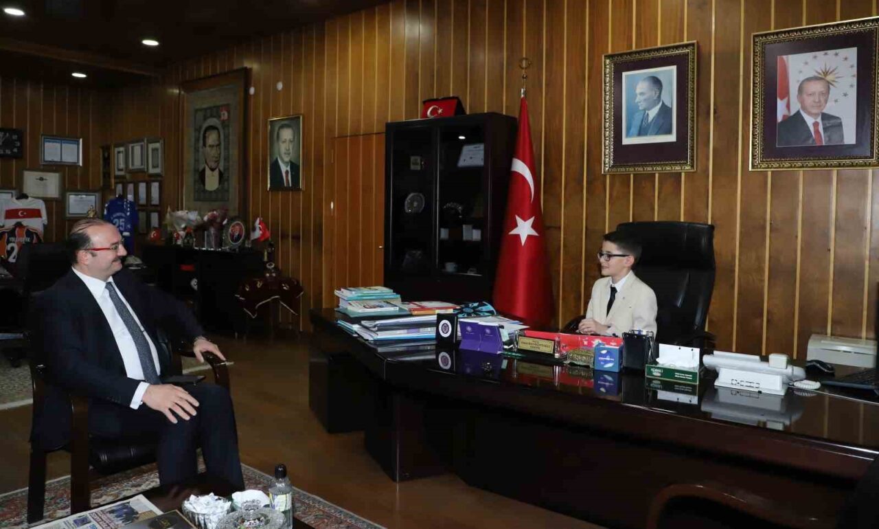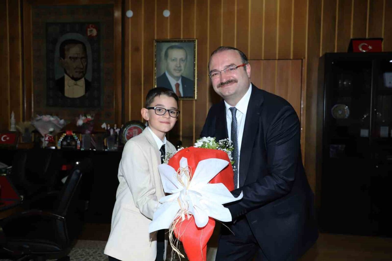 Gazi Mustafa Kemal Atatürk’ün çocuklara armağan ettiği bu özel günde, temsili devir teslim töreni çerçevesinde, Atatürk Üniversitesi Rektörü Prof. Dr. Ahmet Hacımüftüoğlu koltuğunu bir günlüğüne Vakıf Okulları 5. sınıf öğrencisi Ahmet Enes Sağlam’a devretti.