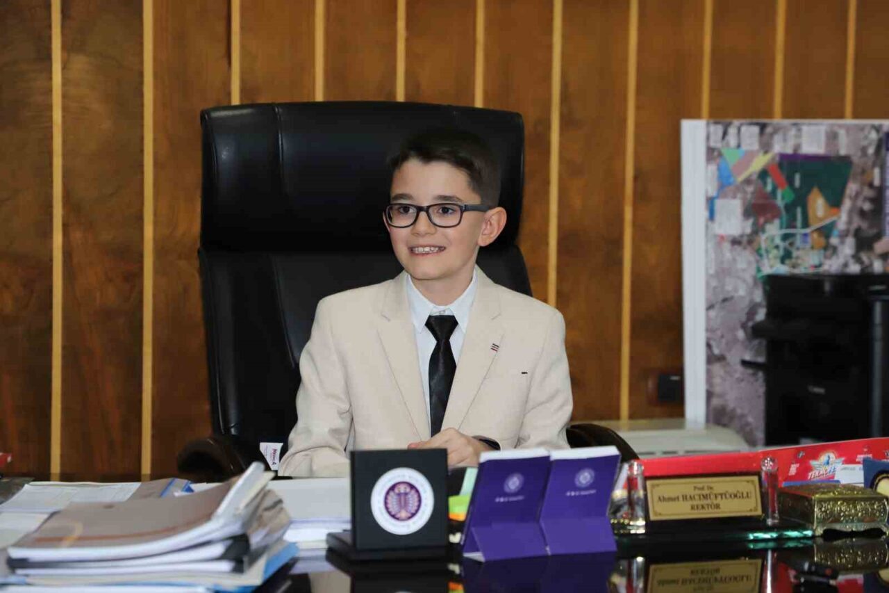 Bilim insanı olma hayalini dile getiren Ahmet Enes, görev süresi boyunca ilk icraat olarak oyun parkı yapılması talimatını verdi. Rektörlük makamındaki kararlılığı ve özgüveniyle dikkat çeken minik rektör, tören boyunca yüzlerde tebessüm oluşturdu.