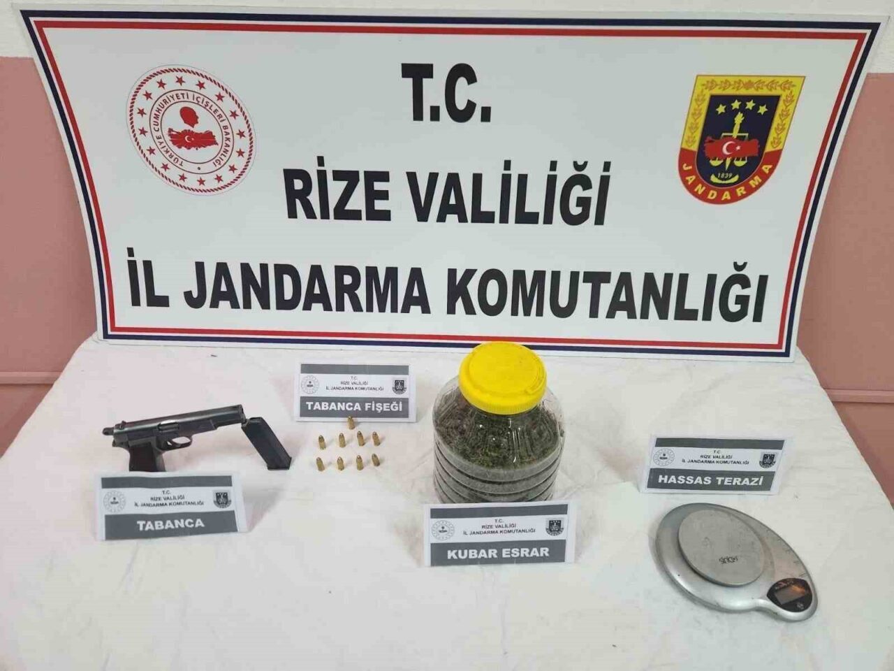 Rize İl Jandarma Komutanlığı tarafından “Uyuşturucu ve uyarıcı maddeler ile 6136 Sayılı Kanuna Muhalefetle Mücadele” kapsamında yürütülen çalışmalar neticesinde Kalkandere ilçesinde operasyon gerçekleştirildi. İki şüpheli şahsın ikametinde ve eklentilerinde yapılan eşzamanlı aramalarda, 1 adet ruhsatsız Browning marka tabanca, 1 adet tabancaya ait şarjör, 9 adet 9×19 mm mermi, 1 adet hassas terazi ve 136 gram kubar esrar ele geçirildi. Rize Cumhuriyet Savcılığı’nın talimatıyla gözaltına alınan şüpheli şahıslar hakkında adli işlem başlatıldı.