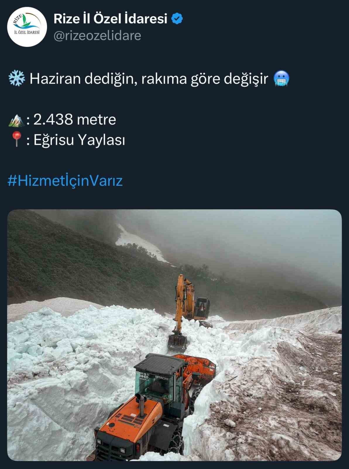Erimeyen kar ve çığların temizleme çalışması ise Rize İl Özel İdaresi ekiplerine kaldı. Haziran ayında olunmasına rağmen devam eden kar temizleme çalışması ise Rize İl Özel İdaresi sosyal medya hesaplarından esprili bir şekilde paylaşıldı. Rize’nin Çamlıhemşin ilçesine bağlı 2 bin 438 metre yükseklikteki Eğrisu Yaylası’nda yürütülen kar temizleme çalışmaları Rize İl Özel İdaresi’nin sosyal medya hesabından “Haziran dediğin, Rakıma göre değişir’ ifadeleriyle paylaşıldı.