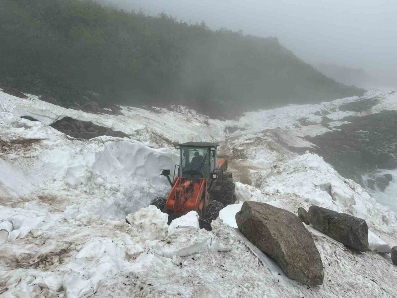 Rize’nin yüksek kesimlerinde kış aylarından kalma çığların temizleme çalışmaları hız kesmeden devam ediyor.