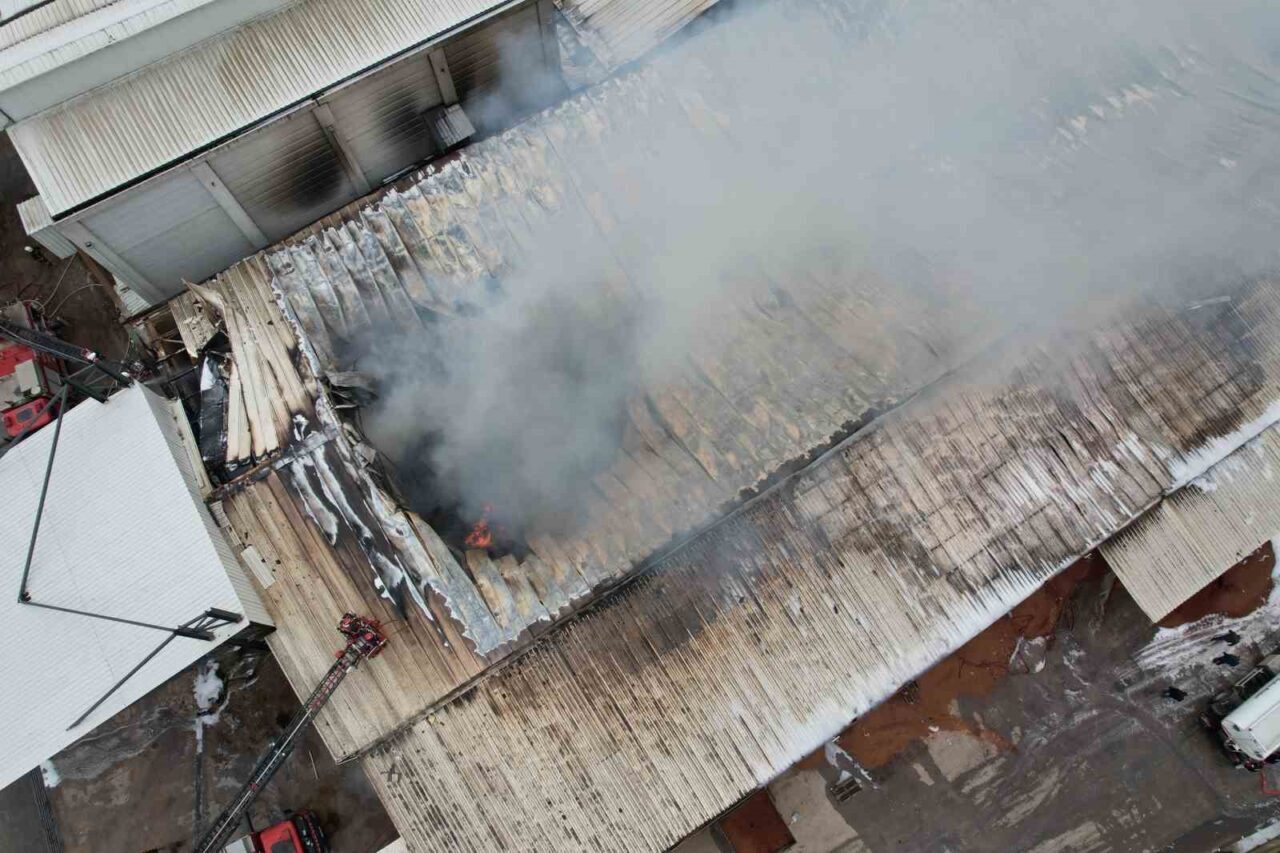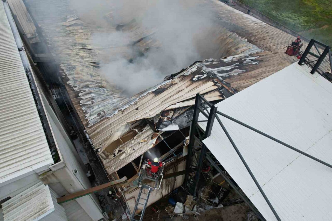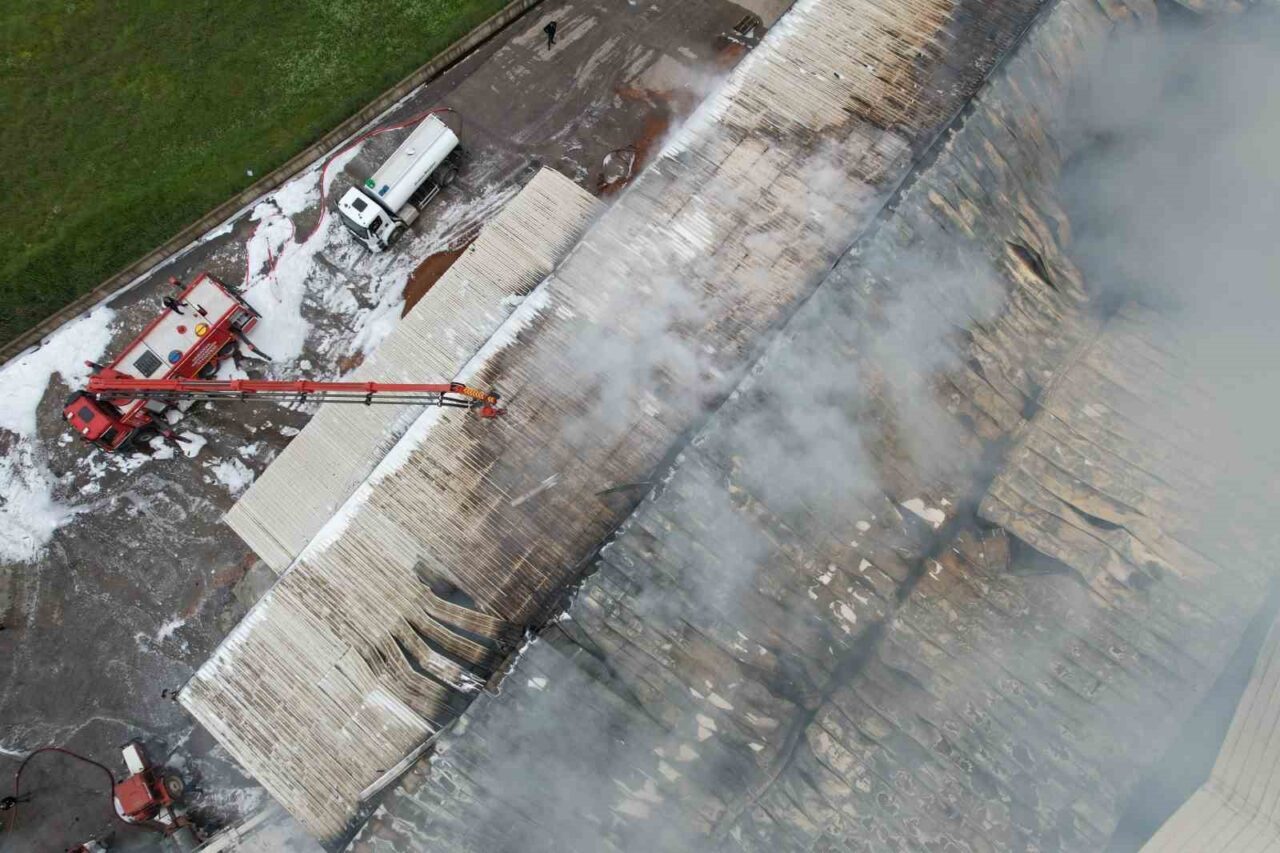 Sakarya’nın Karasu ilçesinde fındık kırım fabrikasında çıkan yangını söndürme çalışmaları devam ederken, ekiplerin mücadelesi ve yangın bölgesi havadan görüntülendi.