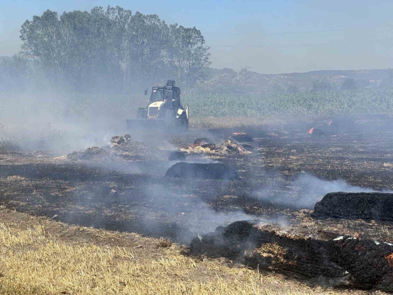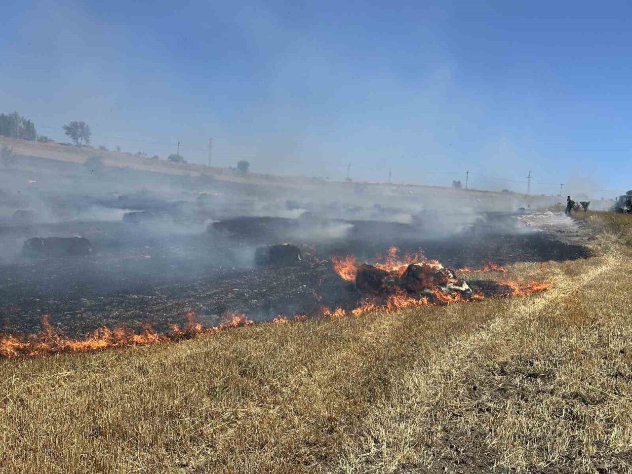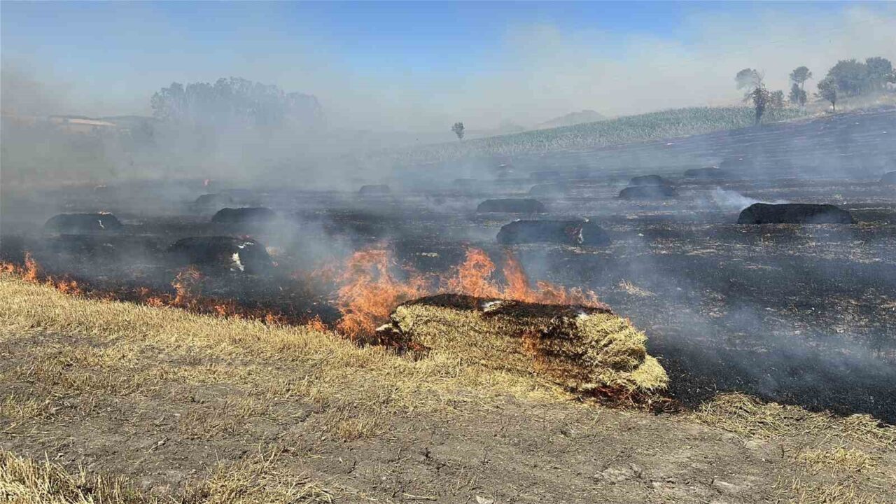 Yangında, tarlada bulunan çok sayıda saman balyası ile ekili araziler büyük ölçüde zarar gördü.