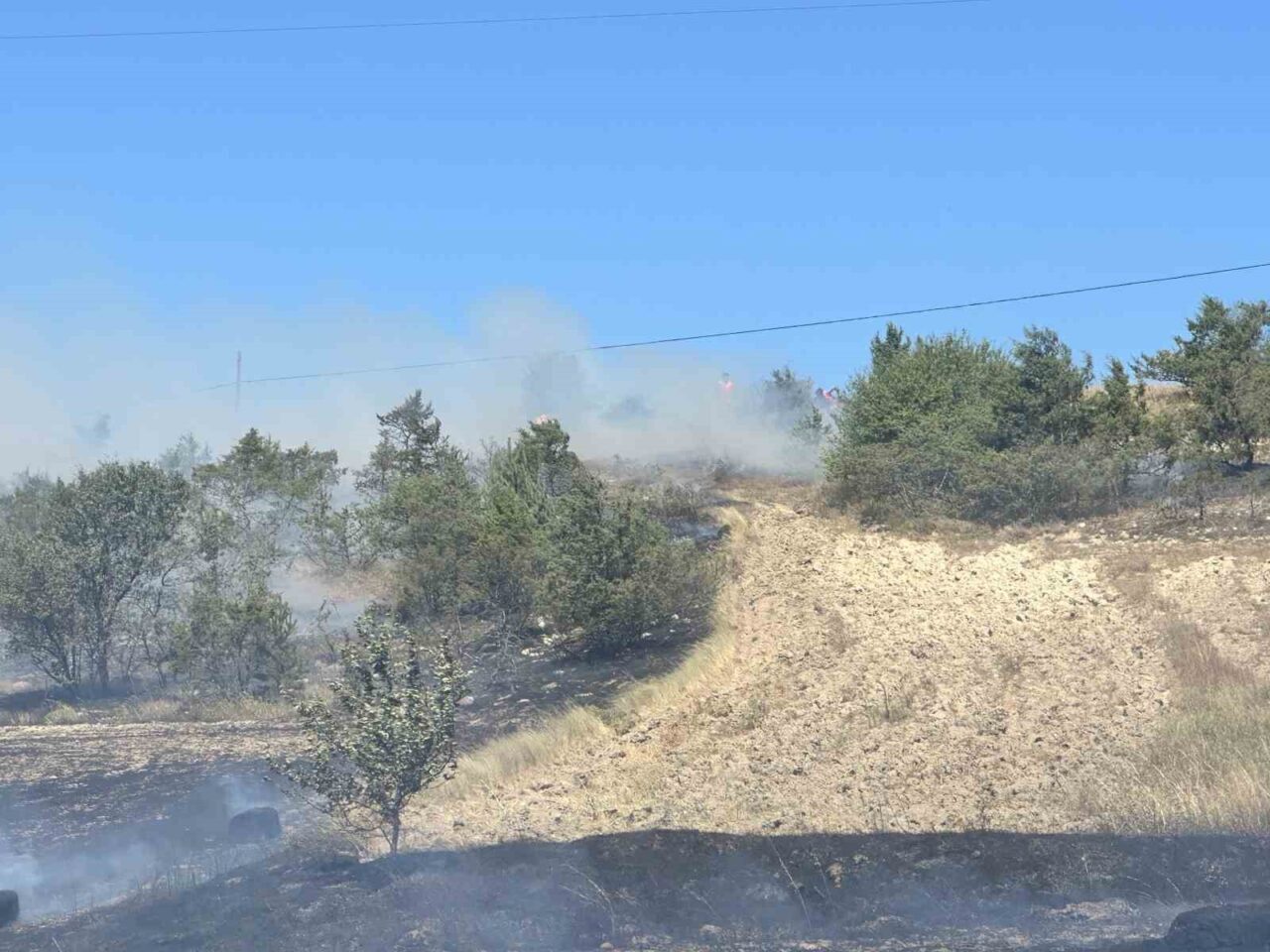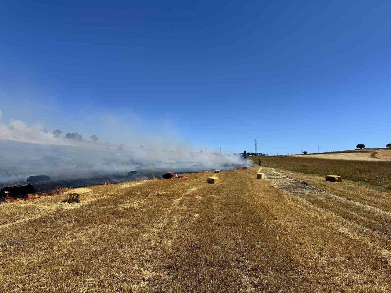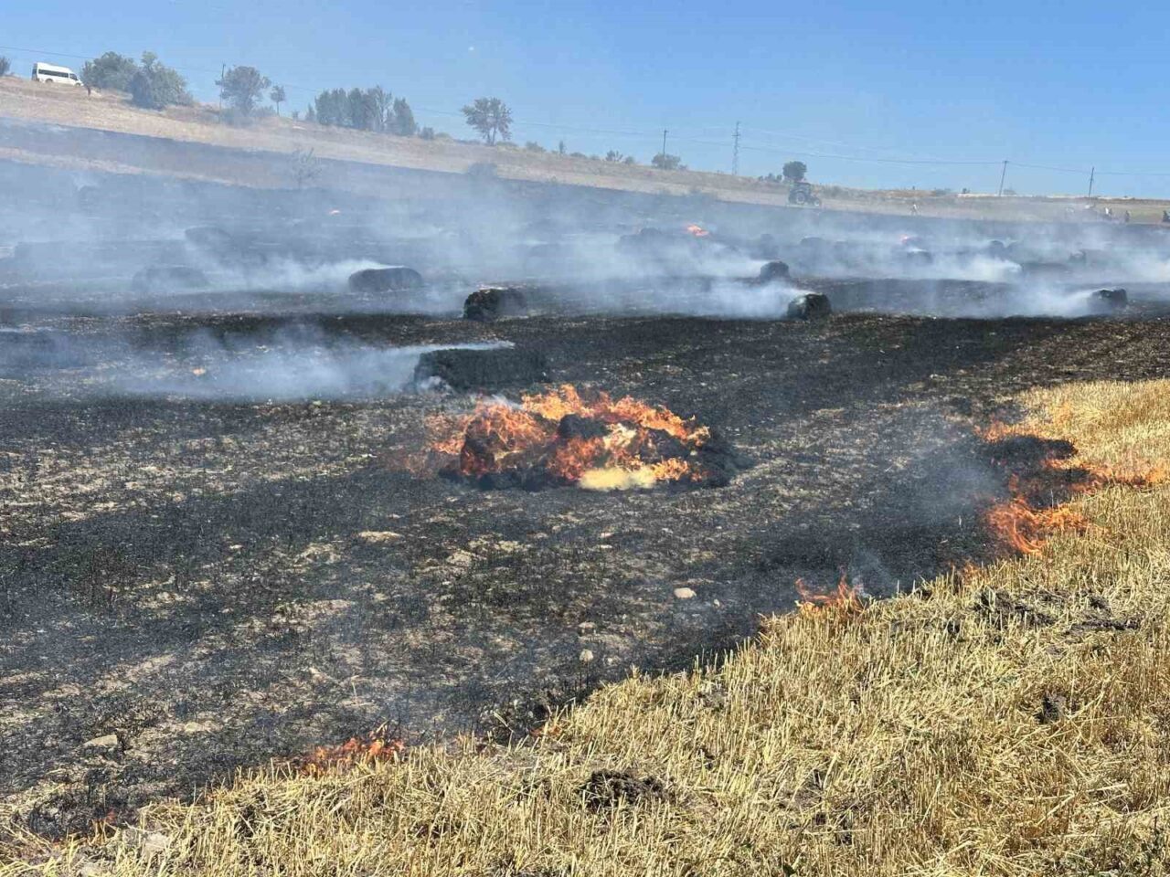 Yangında, tarlada bulunan çok sayıda saman balyası ile ekili araziler büyük ölçüde zarar gördü.