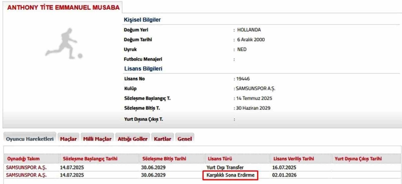 SAMSUNSPOR’DA FENERBAHÇE İLE ANLAŞAN HOLLANDALI KANAT OYUNCUSU ANTHONY MUSABA İLE KARŞILIKLI ANLAŞMAYA VARILARAK SÖZLEŞMENİN FESHEDİLDİĞİ TÜRKİYE FUTBOL FEDERASYONU’NA (TFF) BİLDİRİLDİ.