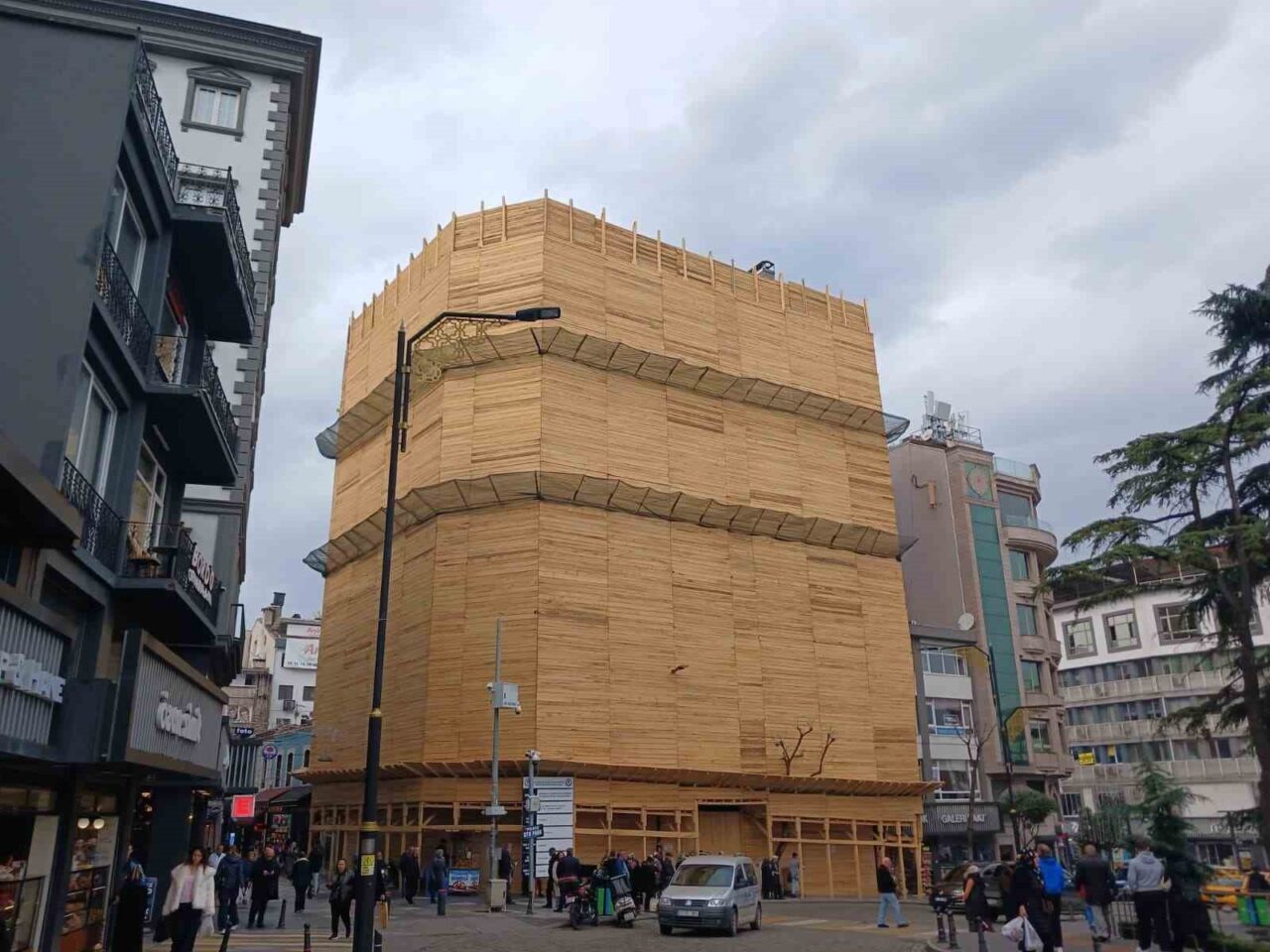 TRABZON KENT MERKEZİNDEKİ EN İŞLEK NOKTALARINDAN UZUNSOKAK’IN GİRİŞİNDEKİ BİR İŞ MERKEZİNİN BAŞLATILAN TADİLAT ÇALIŞMASI NEDENİYLE TAMAMEN KERESTE İLE KAPLANMASI İLGİNÇ BİR GÖRÜNTÜ OLUŞTURDU. ÇALIŞMALAR KAPSAMINDA BİNANIN CEPHESİ, GÜVENLİK AMACIYLA MİLYONLARCA LİRA DEĞERİNDE KERESTEYLE KAPATILIRKEN, BİNA GÖRÜNTÜSÜ İLE ADETA BİR HEDİYE PAKETİNİ ANDIRDI.