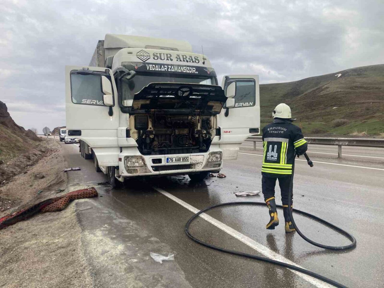 ERZURUM’UN AŞKALE İLÇESİNDE YOLDA SEYİR HALİNDEKİ TIR YANMAKTAN SON ANDA KURTULDU.