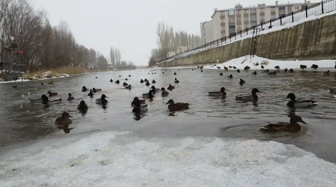 Bayburt’un simgelerinden biri haline gelen yeşilbaşlı ördeklerin sayısında her geçen yıl artış yaşanırken, vatandaşlar da ördekleri yemleyerek destek oluyor. Çoruh Nehri’nin Kaleardı Mahallesi mevkisinde yoğun olarak görülen ördekler, buz tutmuş alanlarda suya dalıp çıkarak görsel bir şölen sunuyor.
