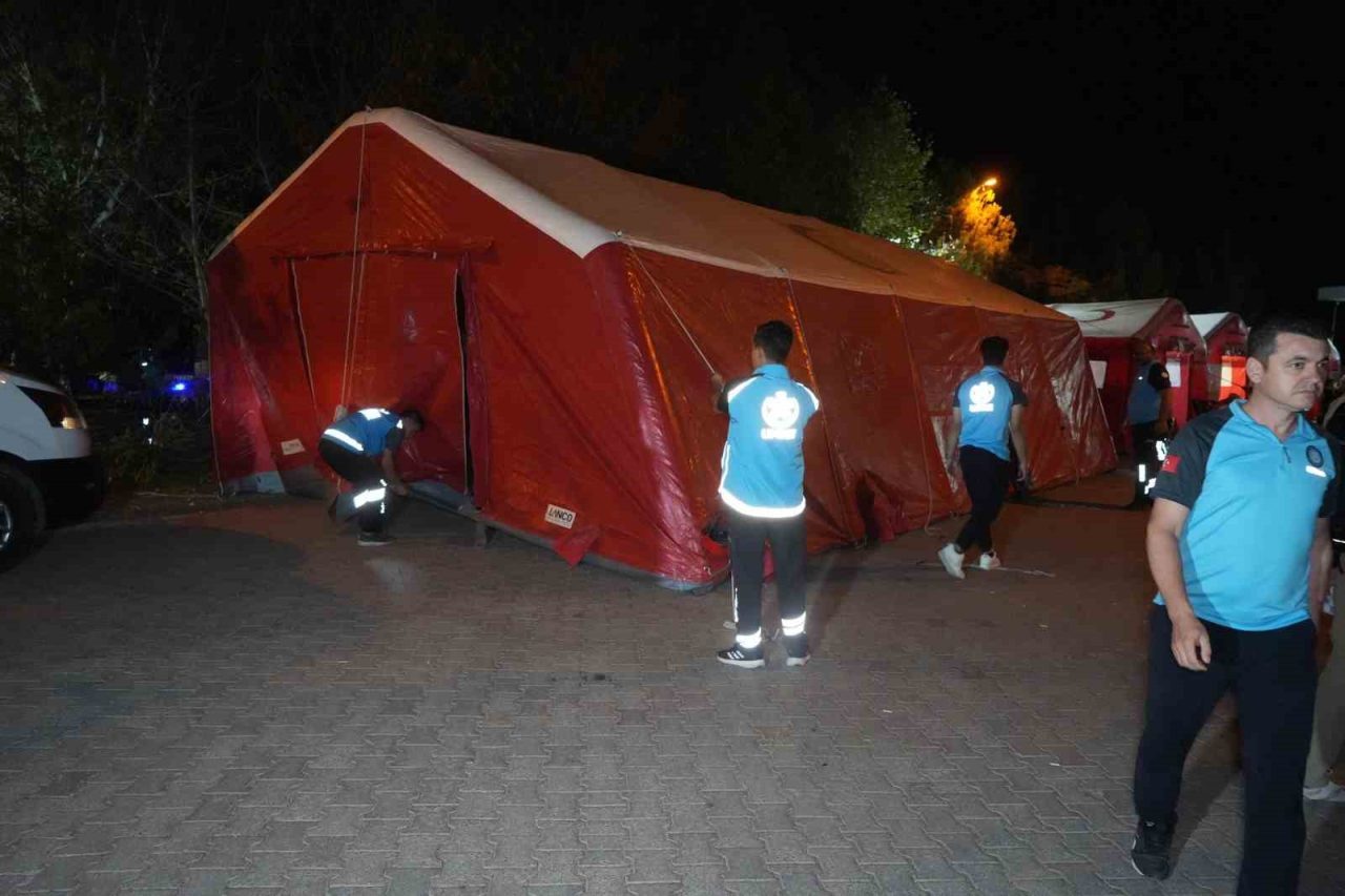 Edinilen bilgiye göre, saat 19.53’te meydana gelen depremin ardından hastane bahçesine sahra hastanesi çadırı kuruldu. Kentteki vatandaşlara bu çadırlarda acil servis hizmeti verilmeye başlandı. Sahra hastanesi çadırlarında ilk müdahalesi yapılan hastalar, aciliyet durumlarına göre civar illerden gelen 112 ambulansları ile başka hastanelere sevk ediliyor.