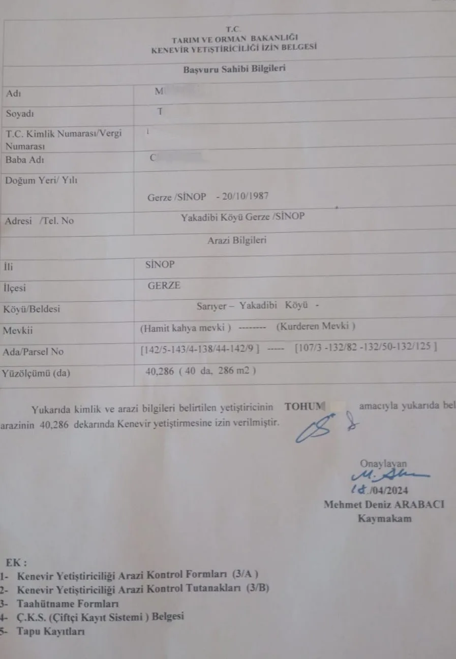 OLAY SONRASI KONUŞAN ARAZİ SAHİBİ M.T., GEÇEN YIL KENEVİR EKİMİNİ RESMİ İZİNLERLE GERÇEKLEŞTİRDİĞİNİ BELİRTTİ.