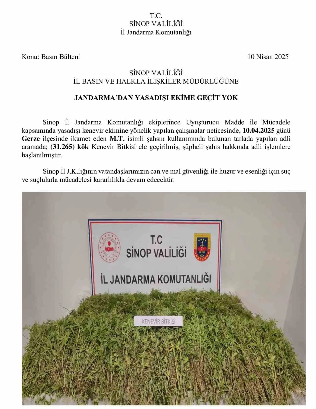 Sinop Valiliği’nden 13 Nisan’da yapılan açıklamada, “Sinop İl Jandarma Komutanlığı ekiplerince uyuşturucu madde ile mücadele kapsamında yasadışı kenevir ekimine yönelik yapılan çalışmalar neticesinde, 10 Nisan 2025 günü Gerze ilçesinde ikamet eden M.T. isimli şahsın kullanımında bulunan tarlada yapılan adli aramada; 31 bin 265 kök kenevir bitkisi ele geçirilmiş, şüpheli şahıs hakkında adli işlemlere başlanılmıştır” denilmişti.