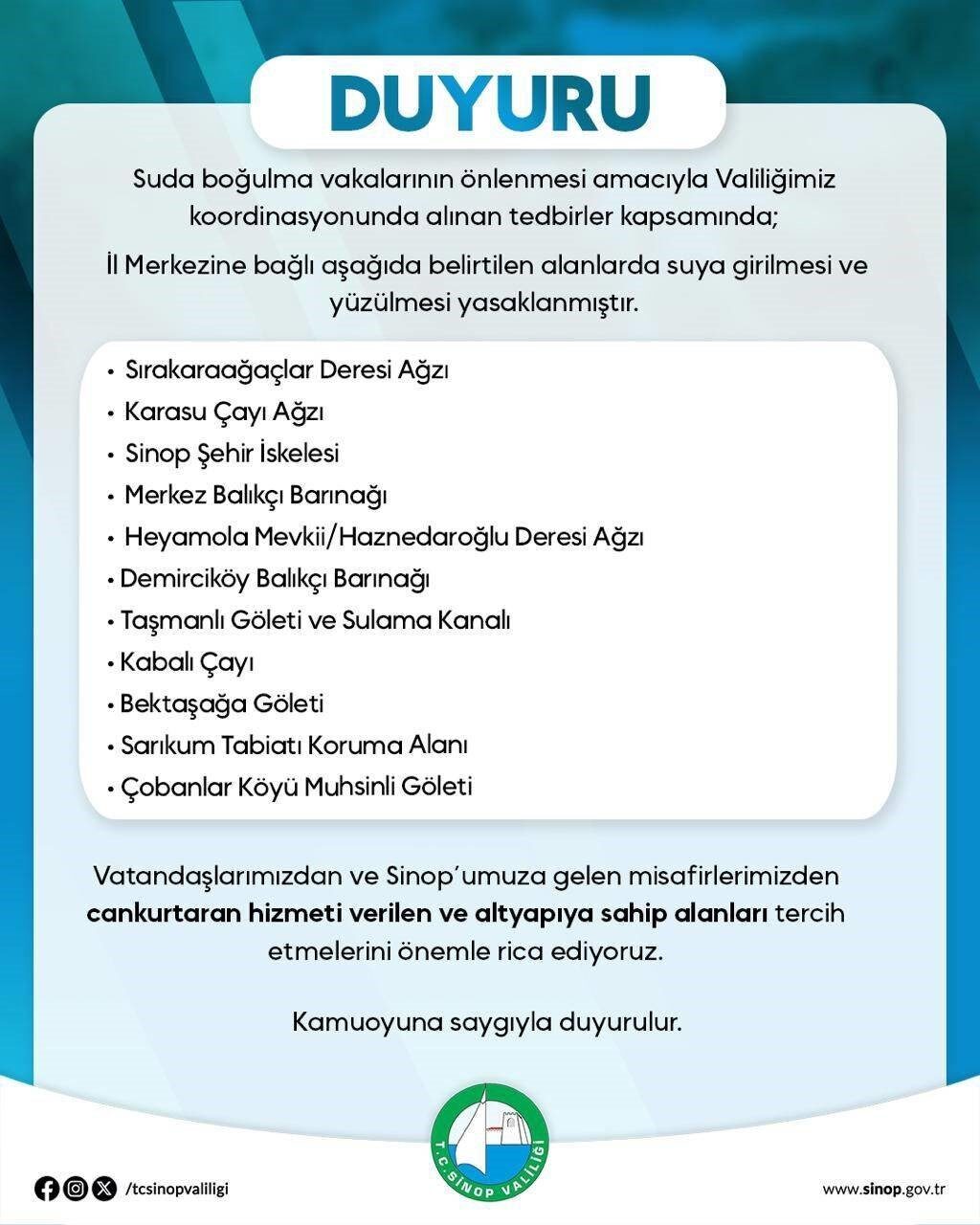 Sinop Valiliği tarafından yapılan açıklamada, özellikle can güvenliğini tehdit eden ve yüzmeye uygun olmayan bazı alanlarda suya girmenin yasaklandığı bildirildi. Yasak kapsamına giren bölgeler şu şekilde açıklandı: