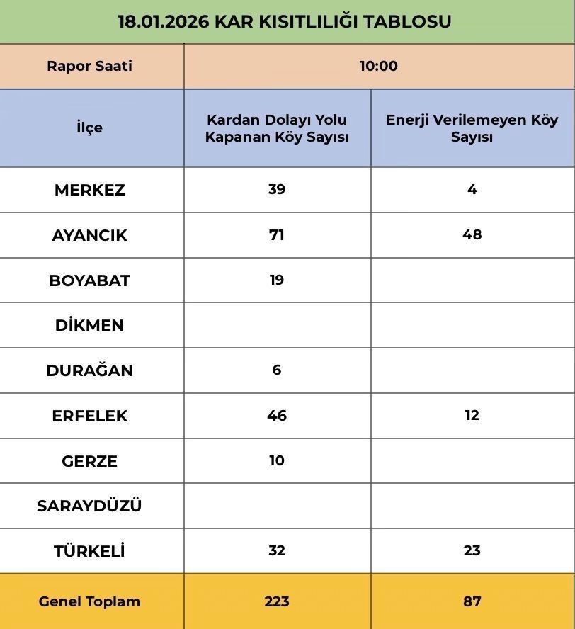Enerji kesintileri de kar yağışıyla birlikte etkisini gösterdi. İl genelinde 87 köyde elektrik kesintisi yaşanırken, kesintilerin yüzde 55’i Ayancık’ta yoğunlaştı. Ayancık’ta 48 köyde enerji verilemezken, Türkeli’nde 23 köy ile kesintilerin yaklaşık yüzde 26’sı, Erfelek’te 12 köy ile yüzde 14’ü ve Merkez ilçede 4 köy ile yüzde 5’i elektrikten etkilendi.