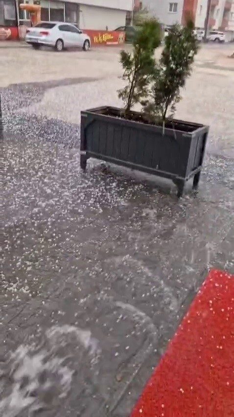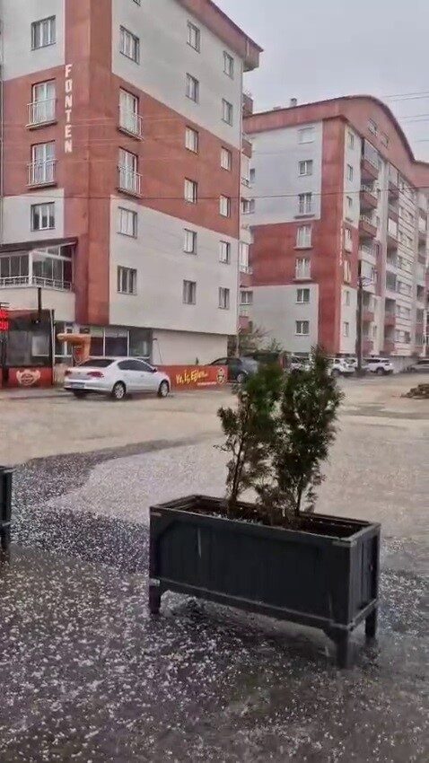 Sivas’ın Şarkışla ilçesinde etkili olan dolu hayatı olumsuz etkilerken, o anlar cep telefonu kamerasına yansıdı.