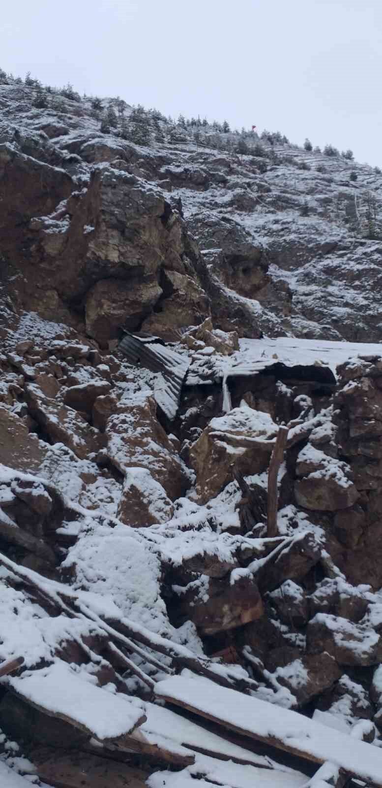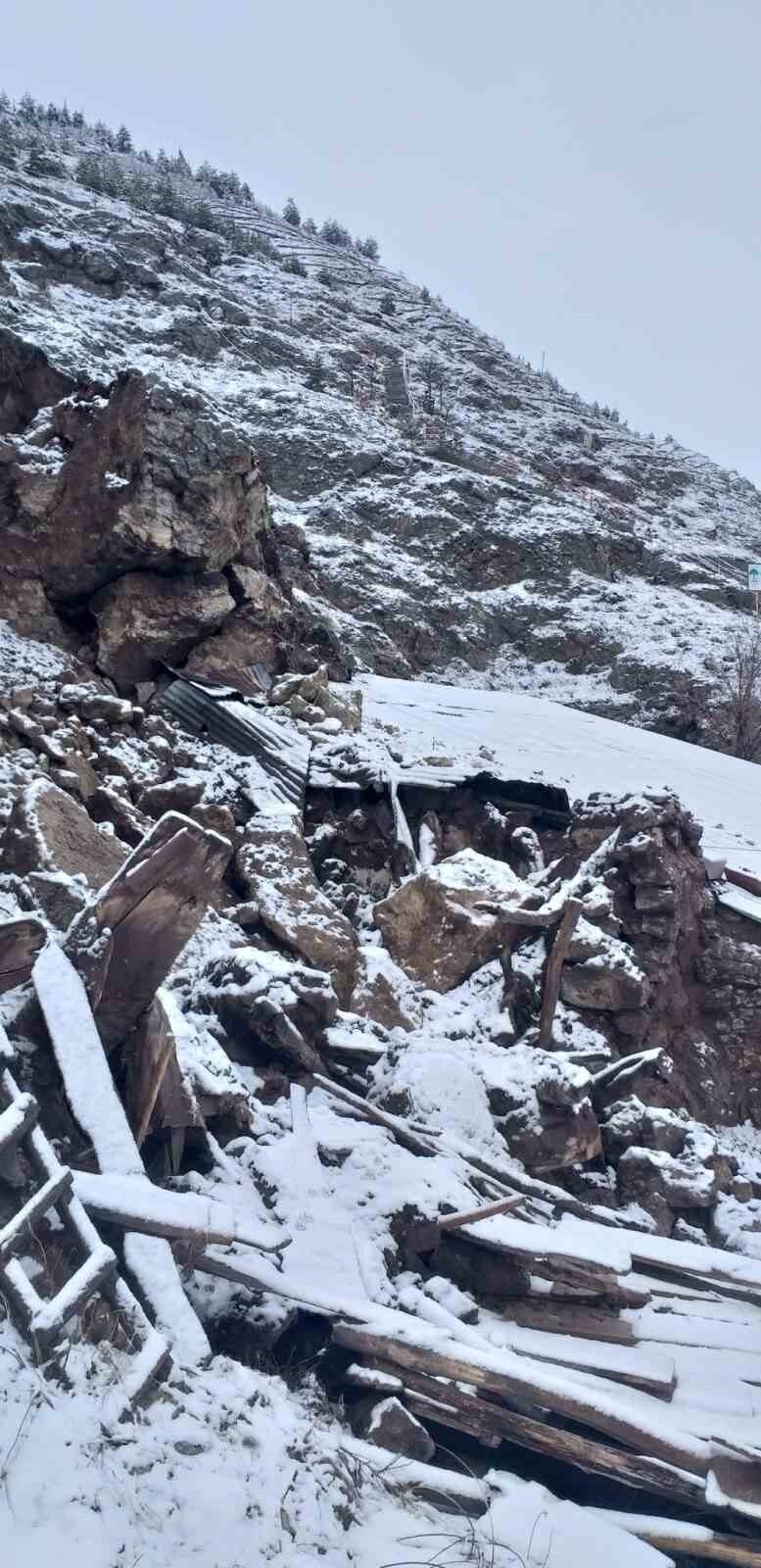 Sivas’ın Zara ilçesinde yamaçtan kopan kaya parçaları hem köy yoluna hem de bir ahıra düştü.