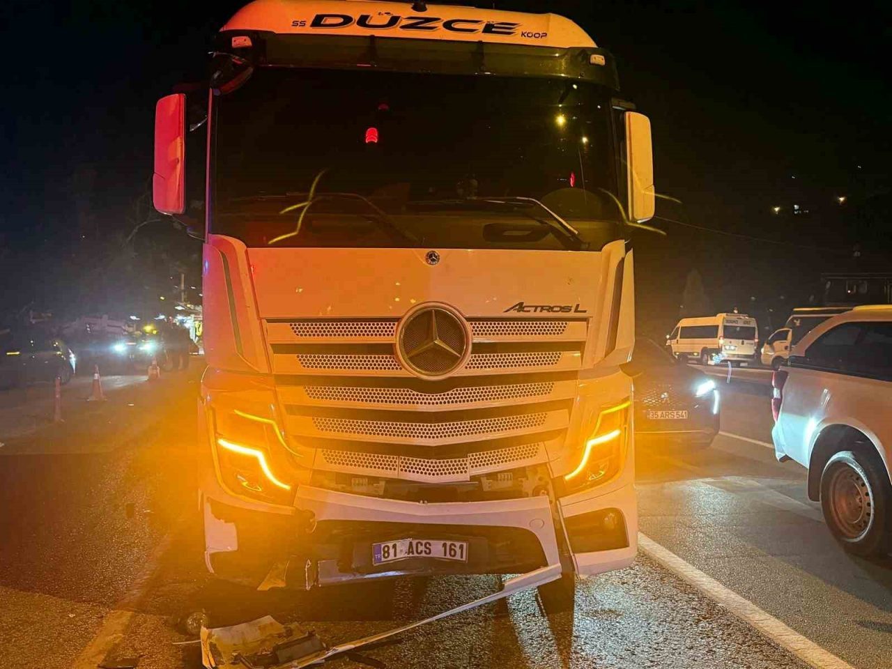 Kaza, D-100 karayolu Aşağıdereköy mevkiinde meydana geldi. Edinilen bilgiye göre, M.T. idaresindeki 24 ABC 653 plakalı Peugeot marka otomobile kırmızı ışıkta durduğu sırada, arkasından gelen R.G. yönetimindeki kamyon çarptı. Çarpmanın şiddetiyle savrulan otomobil karşı şeride geçerek bu kez kırmızı ışıkta bekleyen 81 ACS 161 plakalı tırın çekicisine çarptı. Adeta kağıt gibi ezilerek hurdaya dönen otomobilde sadece şoför mahalli sağlam kaldı. Şans eseri hayatta kalan yaralı sürücü M.T., olay yerinde yapılan ilk müdahalesinin ardından yürüyerek ambulansa gitti. Hastaneye kaldırılan yaralı sürücünün hayati tehlikesinin bulunmadığı öğrenilirken, kaza ile ilgili inceleme başlatıldı.