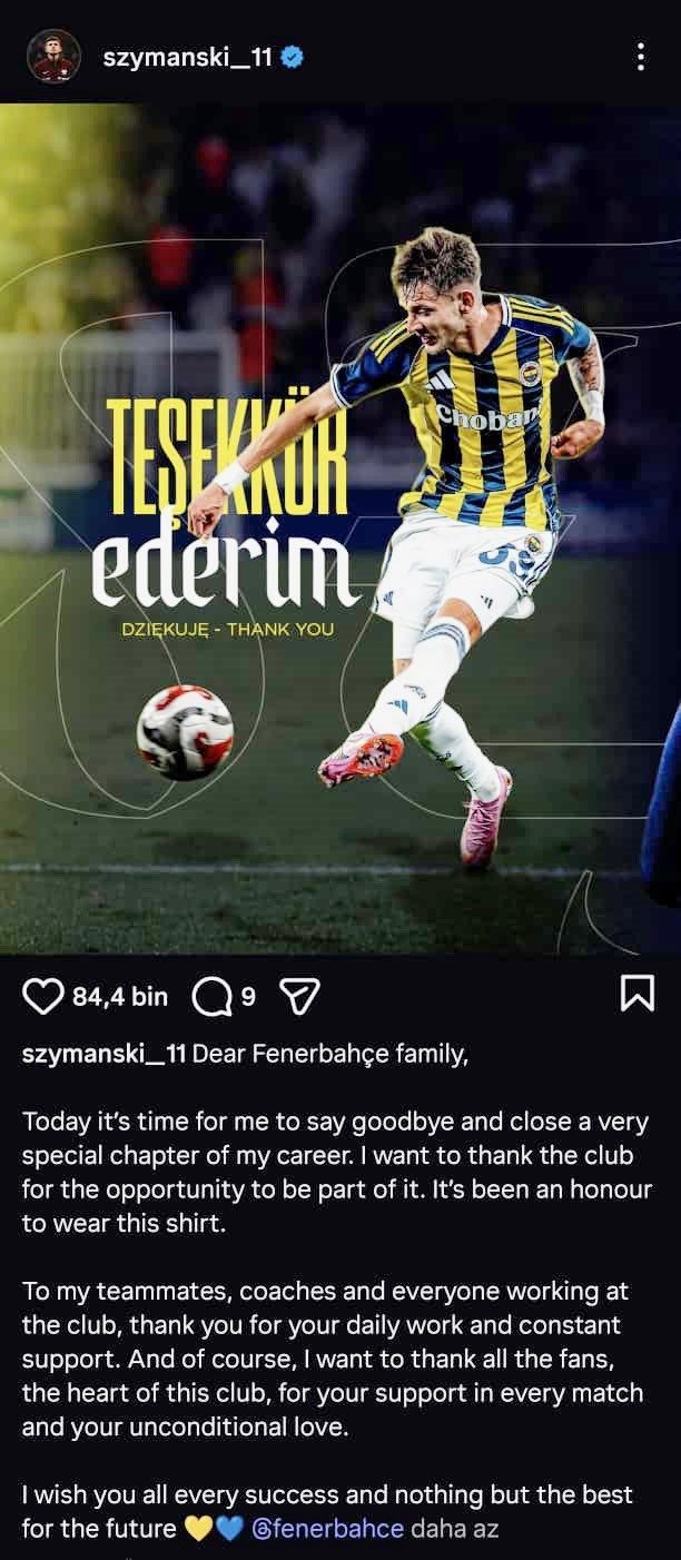 Fenerbahçe’nin Polonyalı orta saha oyuncusu Sebastian Szymanski, sosyal medya hesabından bir açıklama yaparak sarı-lacivertlilere veda etti.