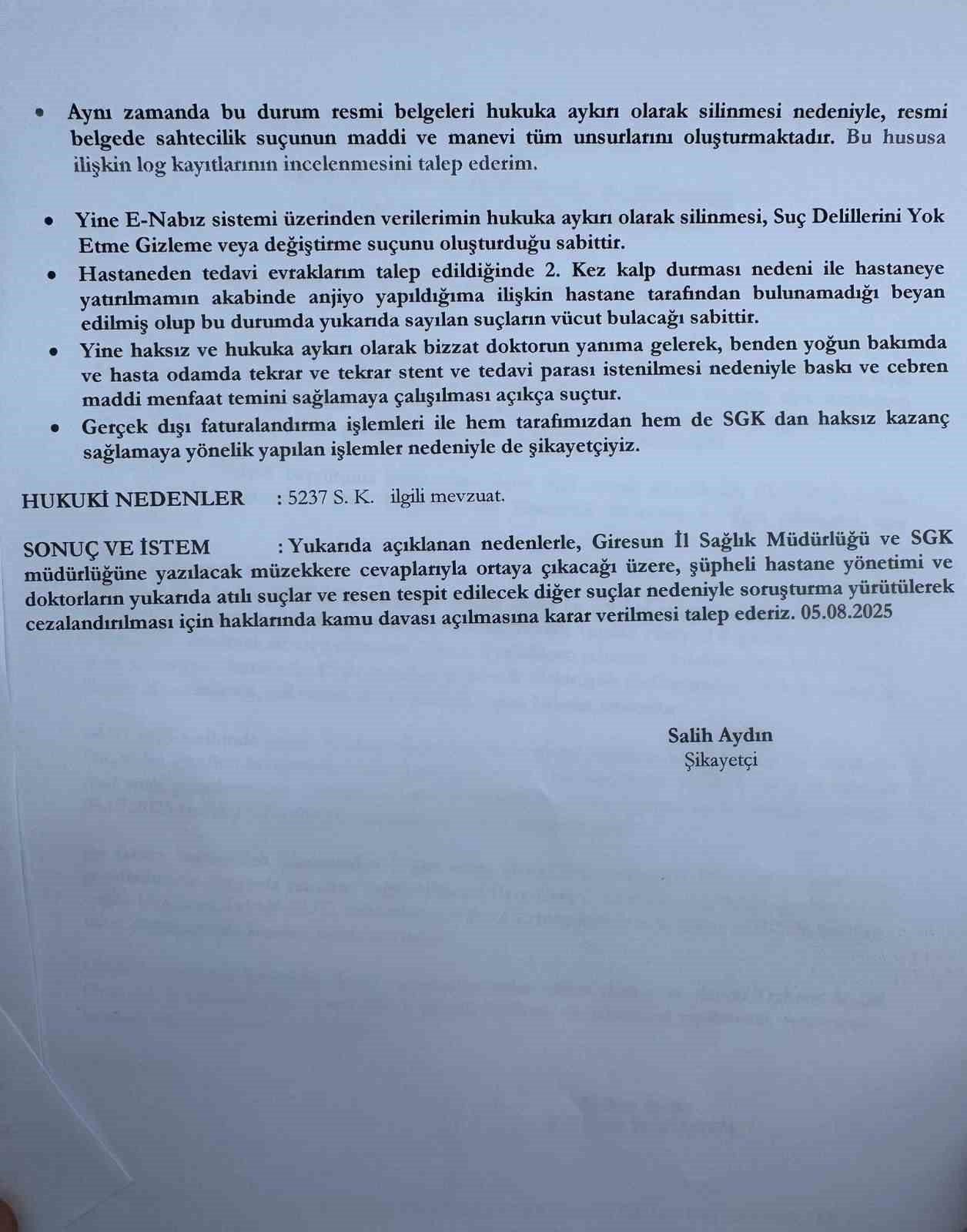 Kasten yaralama, görevi kötüye kullanma, nitelikli dolandırıcılık, evrakta sahtecilik, suç delillerini gizleme ve adam öldürmeye teşebbüs gibi suçlamalarla Giresun Cumhuriyet Başsavcılığı’na suç duyurusunda bulunan Salih Aydın, “Bu olay sadece bizim yaşadığımız bir trajedi değil; hastaneye güvenerek canını emanet eden herkes için ciddi bir uyarıdır. Hukuki süreci sonuna kadar takip edeceğiz. Gerekirse tüm detayları ulusal basına taşıyacağız. Giresun Valisi Mehmet Fatih Serdengeçti, Giresun İl Sağlık Müdürlüğü ve Sağlık Bakanlığı’nı, görevlerini yerine getirerek bu hastane ve benzeri yerlerde denetimleri sıklaştırmaya, ihmallere göz yummamaya davet ediyoruz. Etrafımızdan ve duyumlarımızdan anladığımız kadarıyla bu hastanede benzer ihmaller ve mağduriyetler az değil. Bu tür olaylar ancak kararlı ve sürekli denetimlerle önlenebilir. Sorumlular korunmadığı, aksine yargı önünde hesap verdiği bir süreç işletilmezse, bu yaşananlar yarın başka ailelerin acısı olacaktır” dedi.