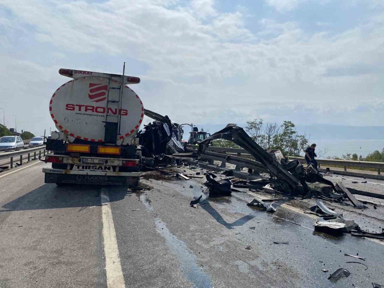 KOCAELİ’NİN DİLOVASI İLÇESİ D100 GEÇİŞİNDE, SÜRÜCÜSÜNÜN KONTROLÜNÜ KAYBETTİĞİ TANKER, BARİYERLERE DALARAK MAKASLADI