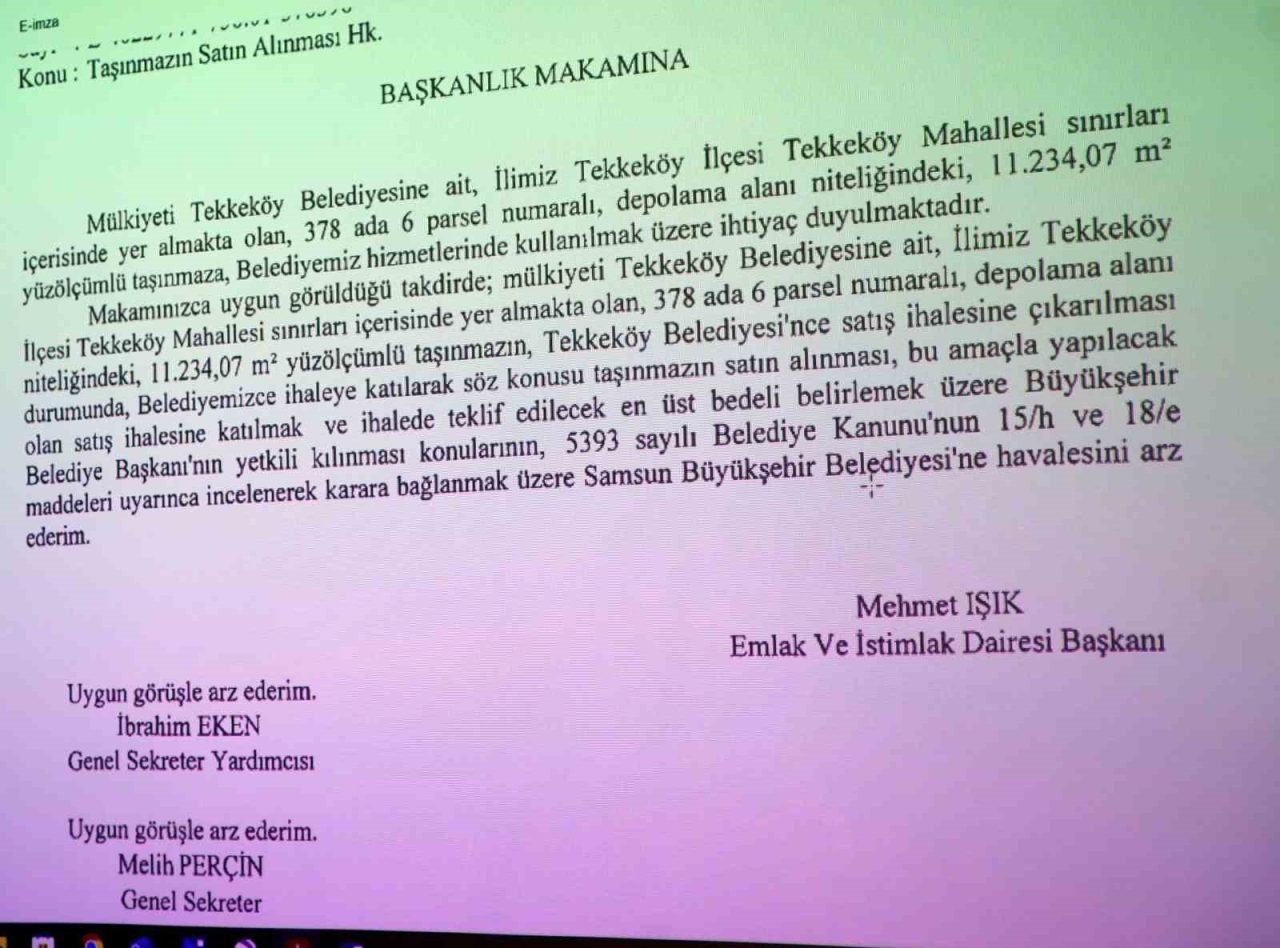 SBB Genel Sekreter Yardımcısı İbrahim Eken ise ilçe belediyesinin arsayı istediği rayiç bedelle satabileceğini kaydederek, “Mevzuat kapsamında satın alma gerçekleşmiş. Arsa sanayi alanı olduğundan bakanlığın yüzde 50’ye kadar indirim yetkisi bulunuyor. Buna istinaden indirimli alınmış. Söz konusu arsanın Milli Emlak Kanunu’na göre satın alınması gerçekleştirilmemiştir. Tekkeköy Belediyesi taşınmazı aldıktan sonra piyasa rayicinde istediği şekilde satışını gerçekleştirebilir” ifadelerini kullandı.