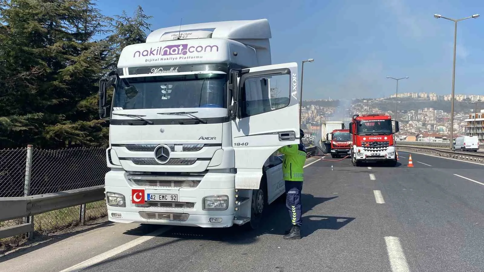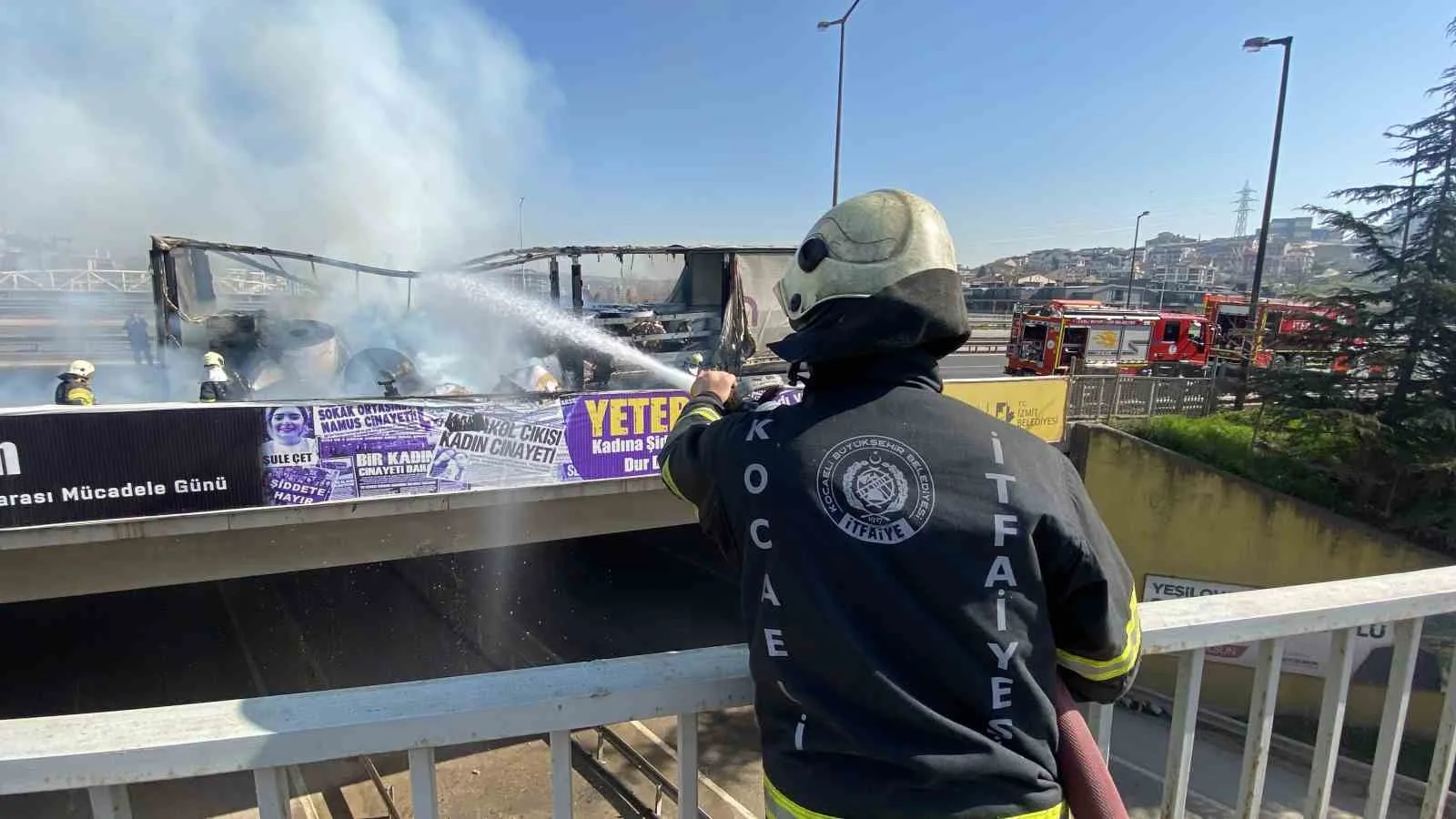 TEM Otoyolu’nun Kocaeli geçişinde lastiği patlayan kağıt rulo yüklü tırda yangın çıktı. Tır alevlere teslim olurken, TEM’in Ankara istikametinde kilometrelerce araç kuyruğu oluştu.
