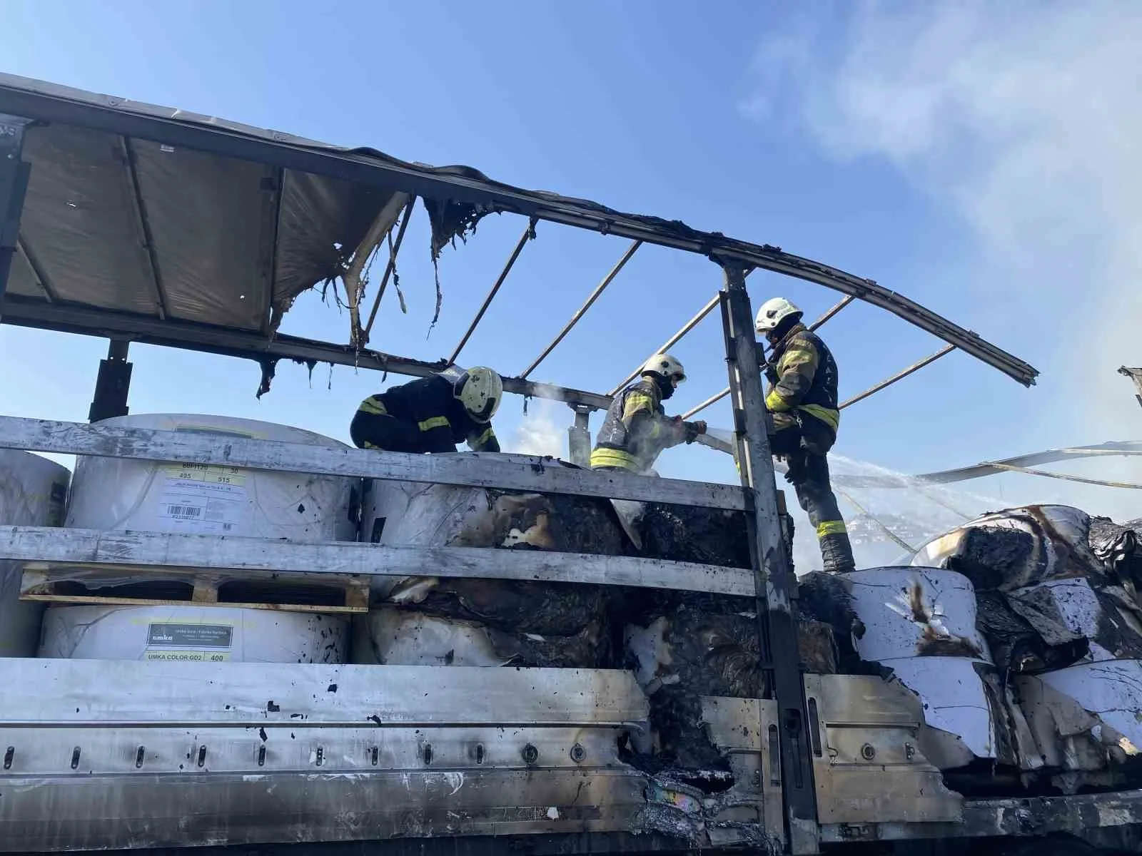 Olay, TEM Otoyolu’nun Ankara istikameti Yenişehir Mahallesi mevkisinde meydana geldi. Edinilen bilgiye göre, Gebze’den yüklediği kağıt ruloları Konya’ya götüren M.Ç. idaresindeki 42 EMC 92 Mercedes marka tırın lastiği patladı. Tırı sağa çeken sürücü, araçtan indiği esnada lastikte yanma meydana geldi. Sürücü yangın tüpüyle alevlere müdahale etmeye çalışsa da başarılı olamadı. Yangının dorseye sıçramasıyla sürücü M.Ç., çekiciyi dorseden ayırarak 112 Acil Çağrı Merkezi’ne ihbarda bulundu. İhbar üzerine olay yerine itfaiye, polis ve jandarma ekipleri sevk edildi. Kısa sürede olay yerine gelen itfaiye ekipleri, yangını söndürmek için çalışma başlattı. Ekiplerin uzun uğraşları neticesinde yangın söndürülürken, dorse kısmı tamamen yanarak geriye demir yığını kaldı.