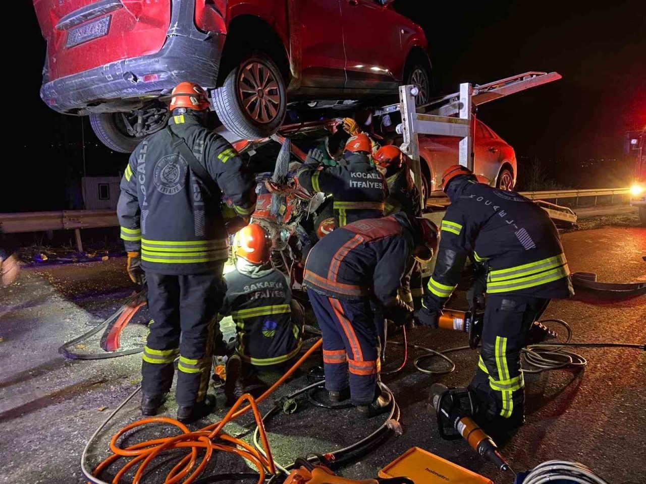 TEM Otoyolu’nun Kocaeli geçişinde tıra arkadan çarpan kamyonetin sürücüsü, hem çarptığı tır hem de kendi taşıdığı aracın kabine kayması sonucu iki taraftan mahsur kaldı. İtfaiye ekiplerinin, üstten sarkan aracın düşmemesi için vinçle sabitleyerek gerçekleştirdiği titiz çalışmada, yaralı sürücü uzun uğraşlar sonucu sıkıştığı yerden kurtarıldı.