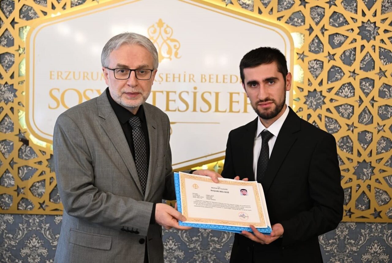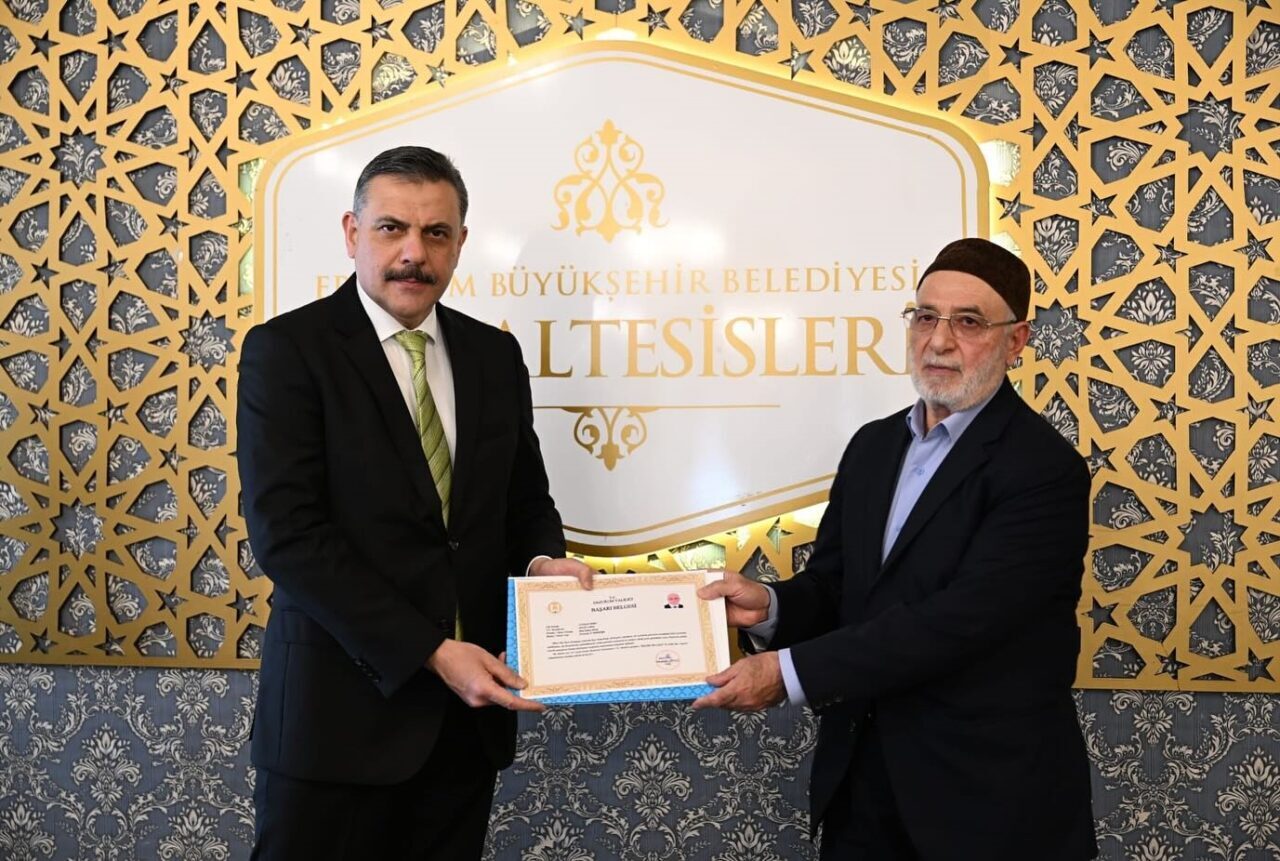 Erzurum Valisi Mustafa Çiftçi, Ramazan ayında teravih namazlarını hatimle kıldıran 29 din görevlisine ve TRT 1 ekranlarında yayınlanan Kur’an-ı Kerim’i Güzel Okuma Yarışması’nda Türkiye üçüncülüğü elde eden Palandöken Ebu İshak Camii Müezzin-Kayyımı Engin Şahin’e başarı belgesi takdim etti.