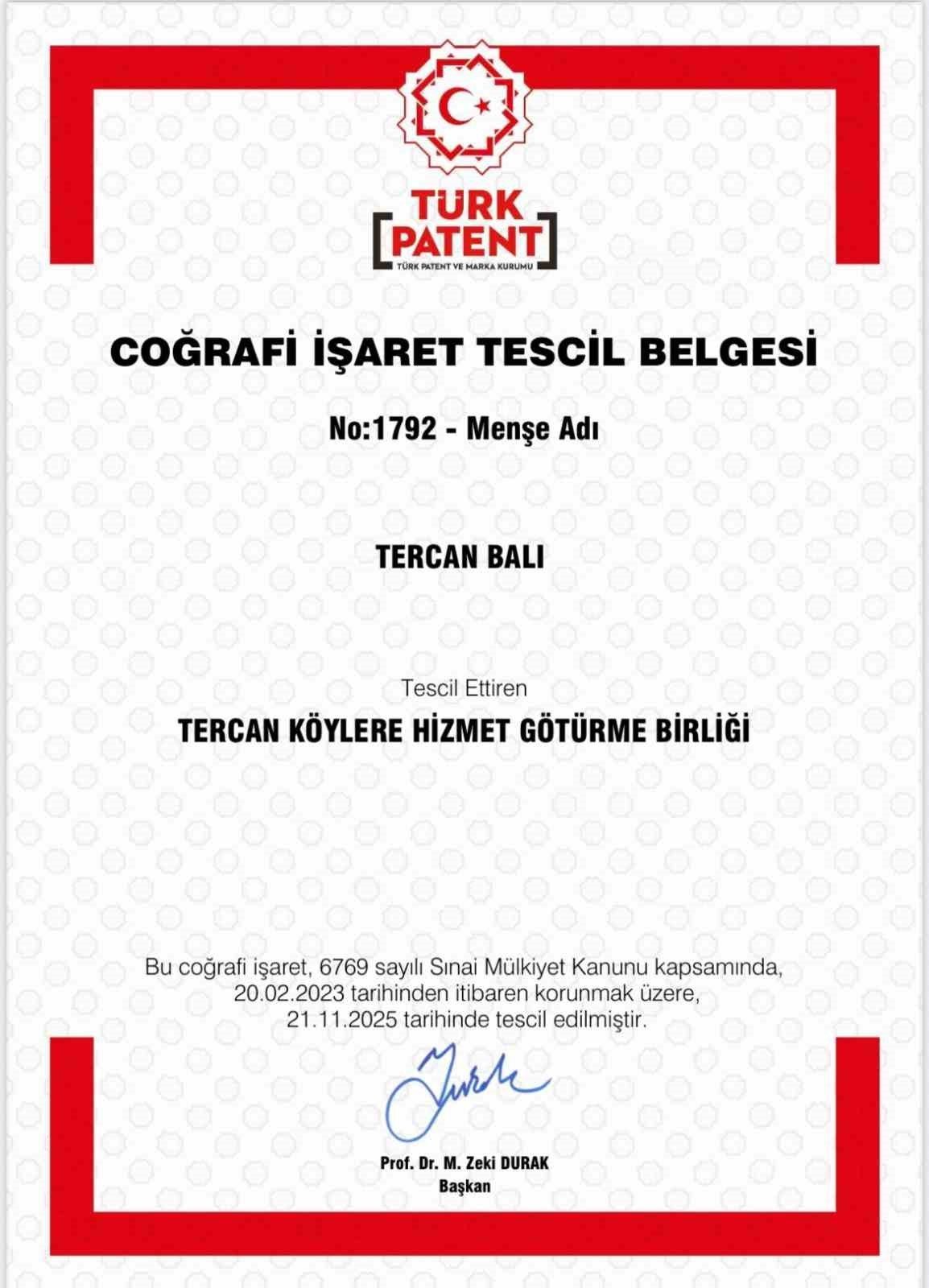 Tercan’ın zengin florasında çalışan arıların ürettiği eşsiz bal Türk Patent ve Marka Kurumu tarafından tescil edilerek Coğrafi İşaret Belgesi almaya hak kazandı.